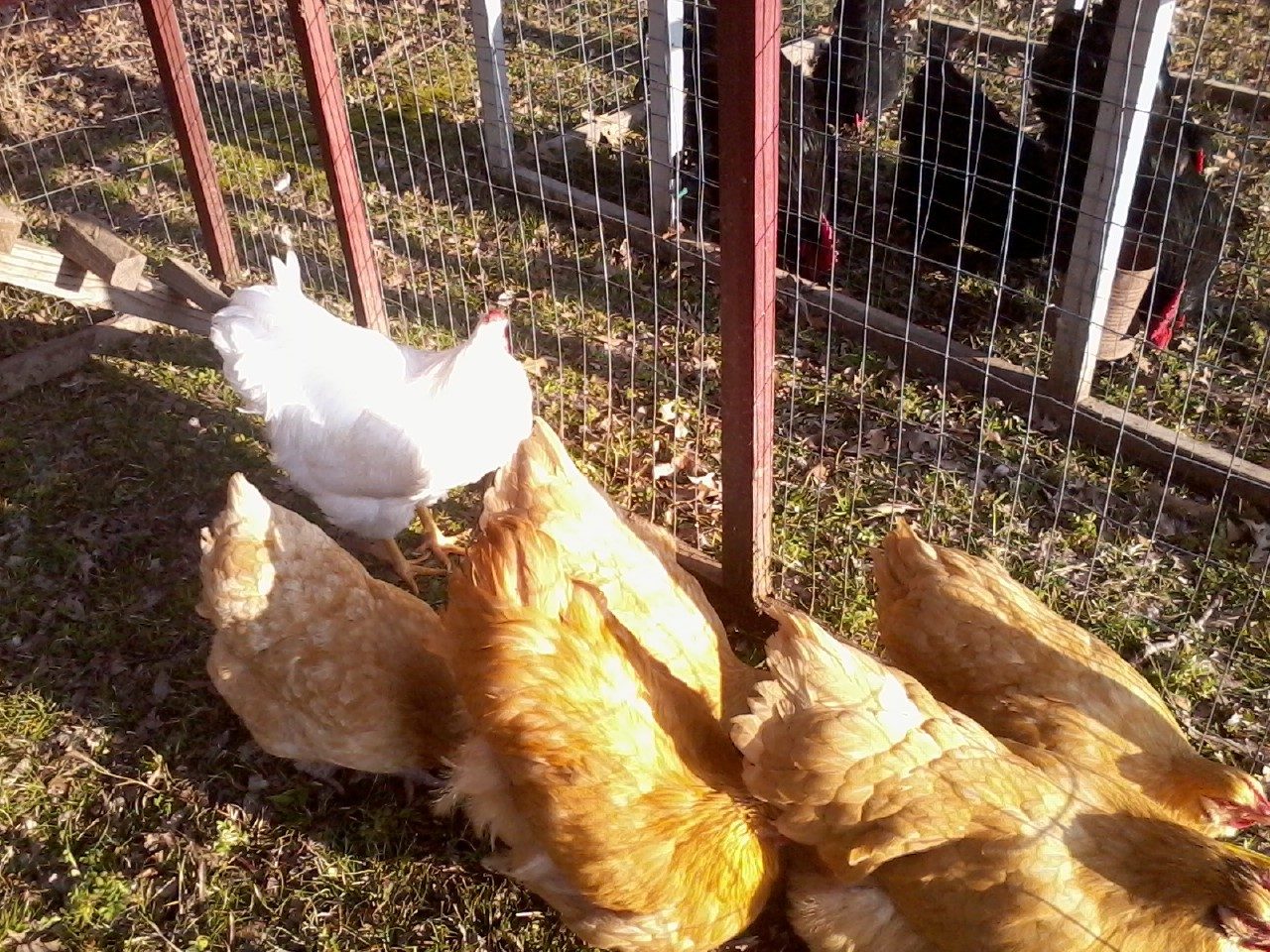 He has yet to show any affection for the girls, so we still have the JB Harrell line white Wyandotte cockerel with the Buff Orpingtons. Will take those offspring back to our Cecil Moore line white Orpingtons. In these photos the Wyandotte is 9 months old. Junior is about 5 months old. The size differences (or lack of) are amazing!