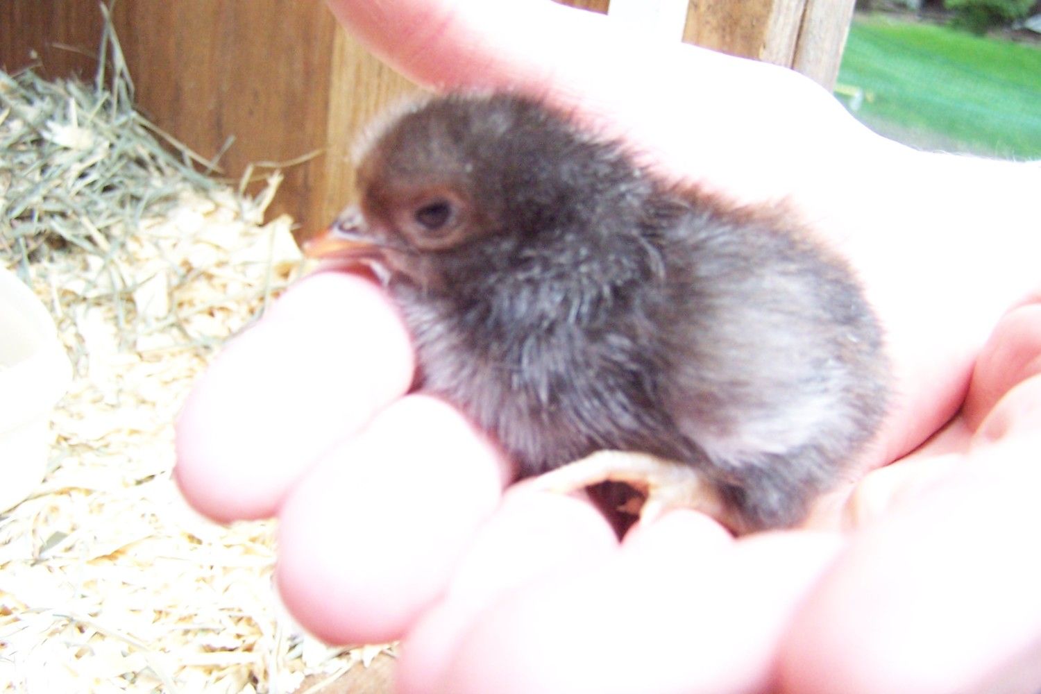 ) and the little Banty yellow chick on the right came from a Banty size blue egg...and is Leonarda (from Mutant Ninja Turtles). She has black lines on her back that don't show here. (Can't get her to hold still to see her back stripes).![]()
