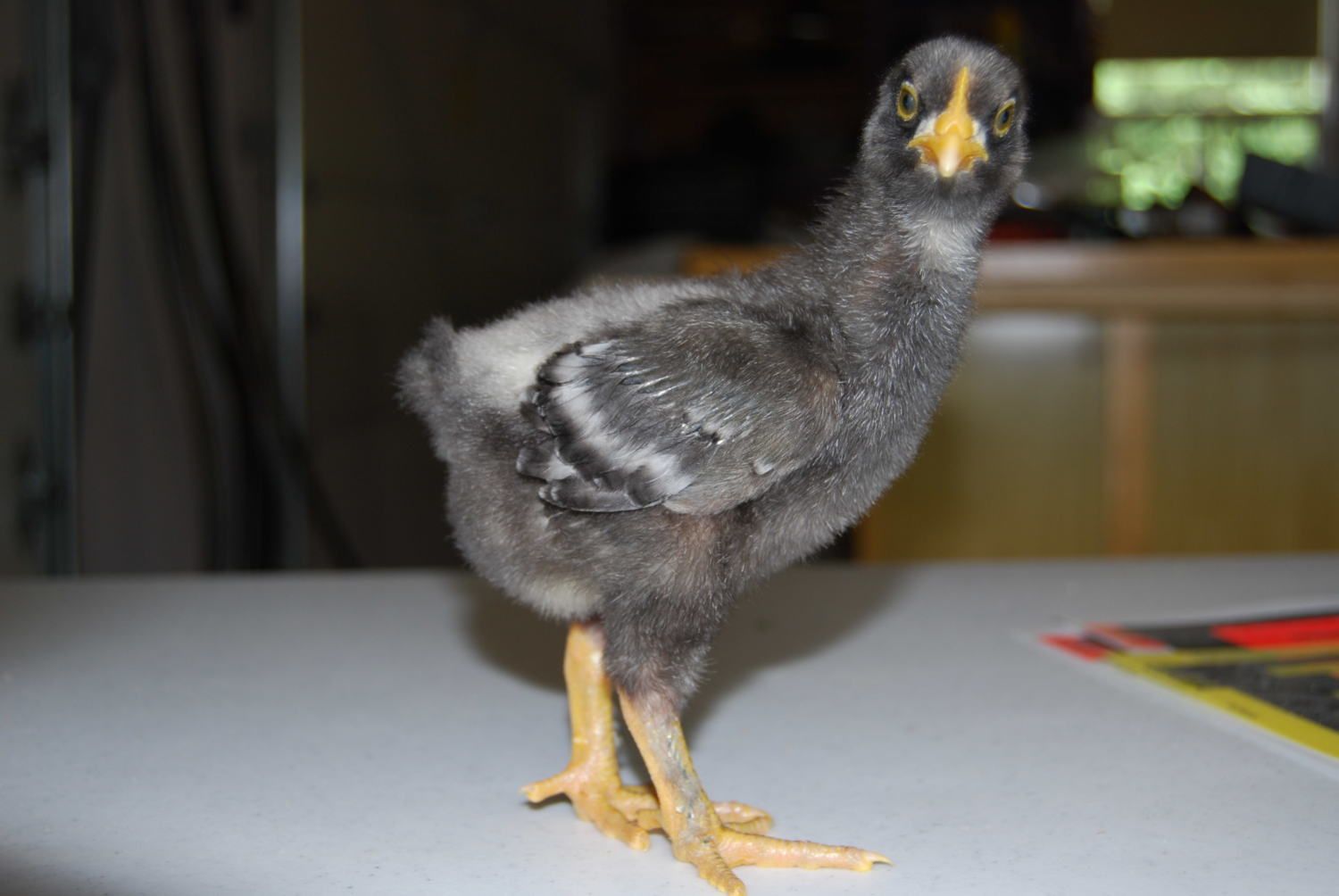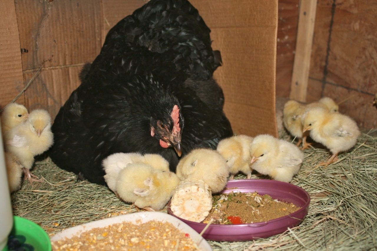 Black Cochin hen and a slew of Hatchery chicks - Delawares / Salmon Faverolles