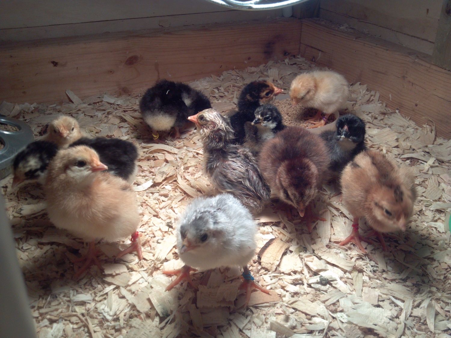 Leghorn cross chicks all packed into their food dish turned nest box
