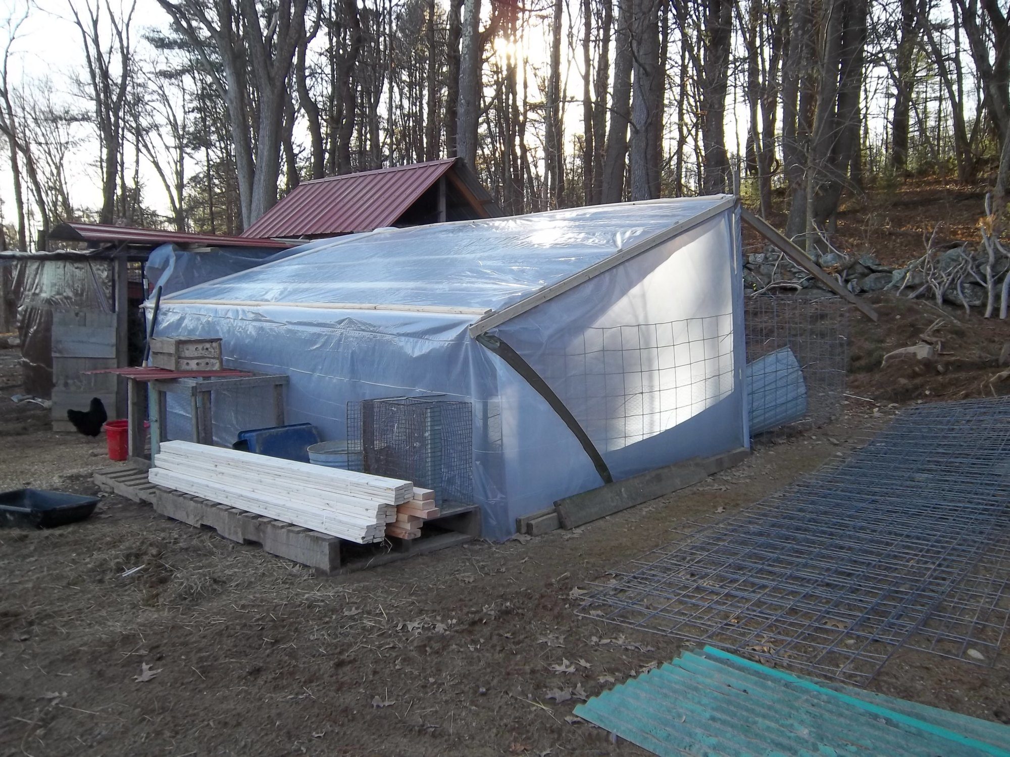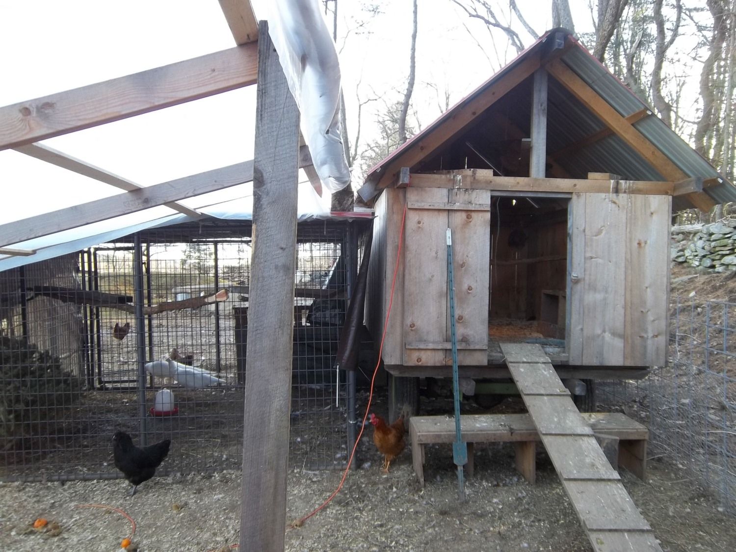 I have to get more photos, but this is the main layers coop i have 2 other coops on wheels, one is on a tractor supply trailer and this one is on a old hay wagon frame. i have one on a pop up trailer camper wheel set too. They are fun to build and the best part is you can move them!!!!!!! here is the run we build around it for the winter. and to keep heat in.