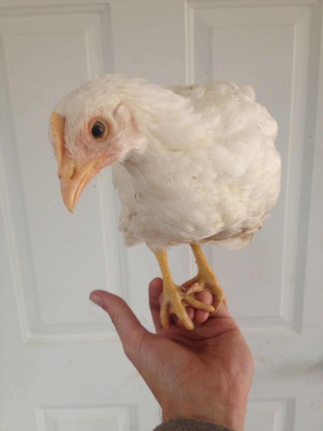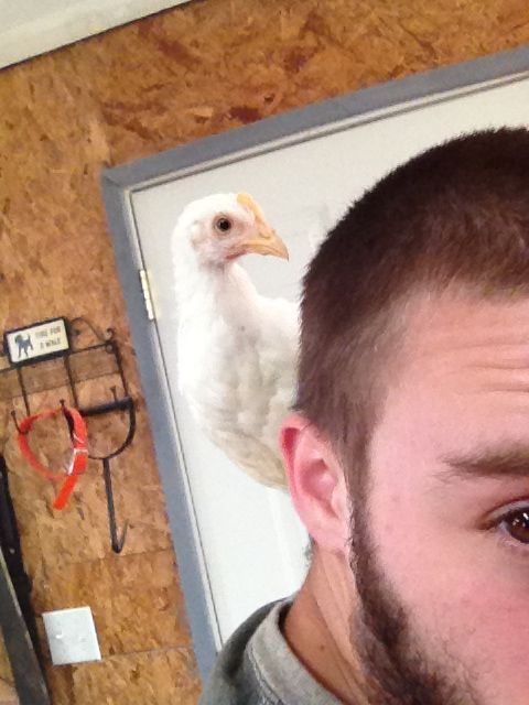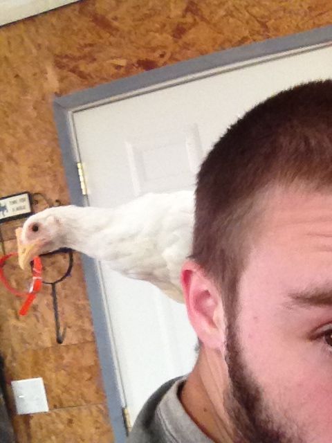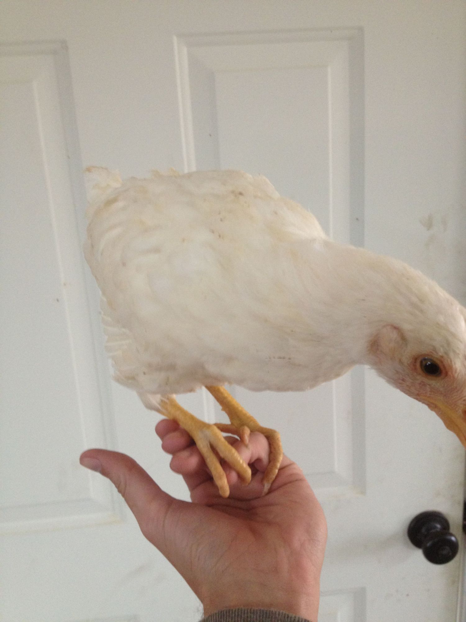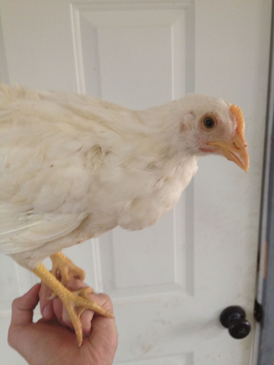 These are pictures of my 1 1/2 month old pullet, she goes straight for my hand now because she knows theres a cricket treat waiting for her somewhere she just has to get on the hand and I take her to the delicious treats!