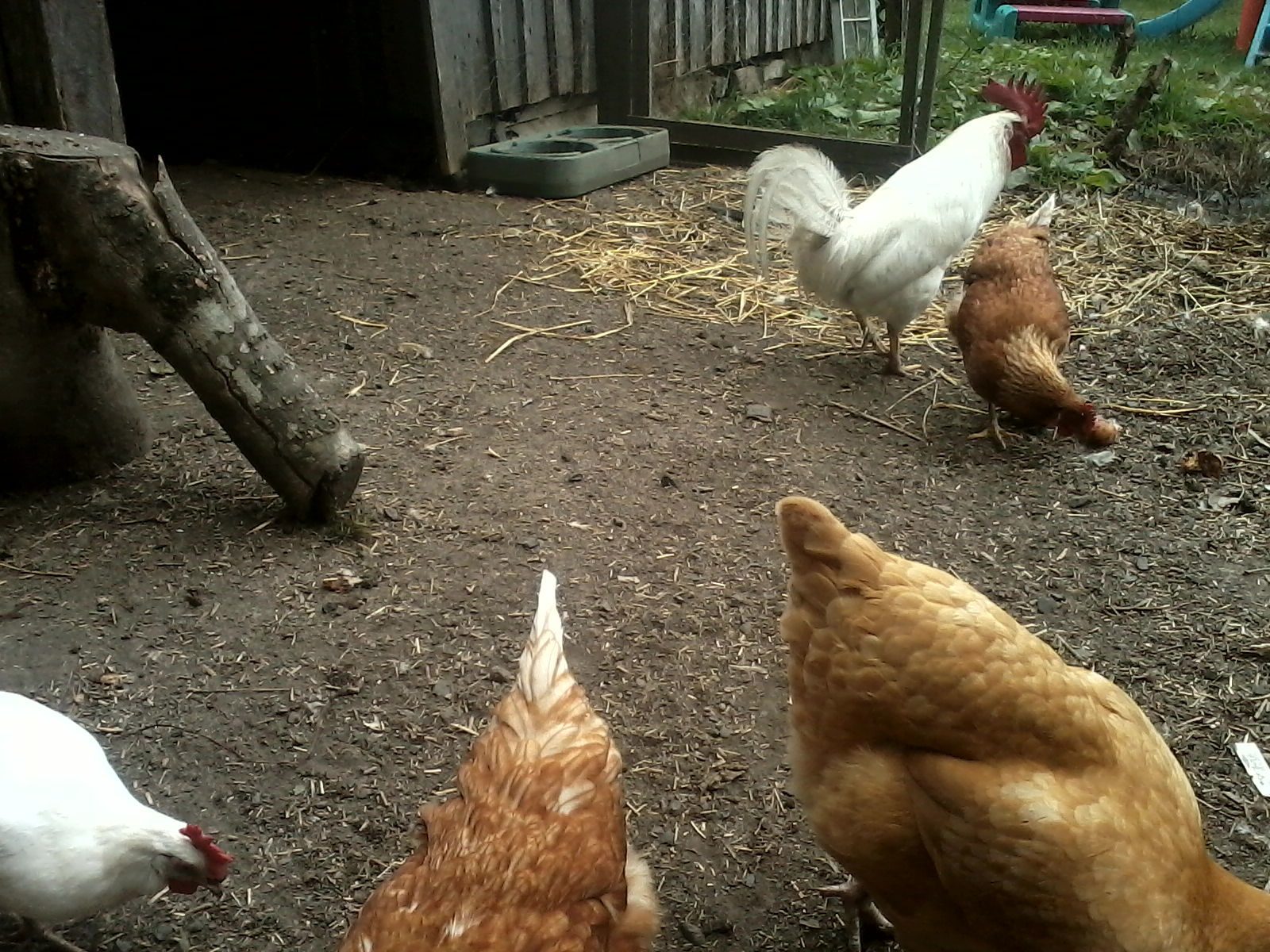 Last week hubby bought me a new wagon (the Gorilla wagon, it's called), and I load it up twice a month with hay, and twicw a week with garden and weed clipping and lug it into the run. I rake the run while they follow the rake pecking at anything I uncover, then spread out the hay or weeds. He never bothers me except to come see what treats I brought. They all love the wagon and climb all over it whether it's full or empty.