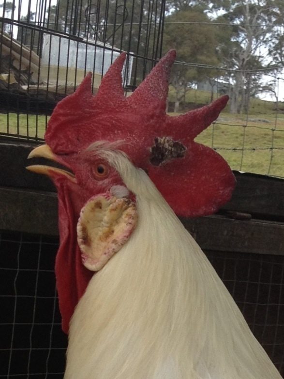 Is it cold where you are? The dark areas on the tips of his Comb look similar to Frostbite.. but the green grass is contradictory, lol.
