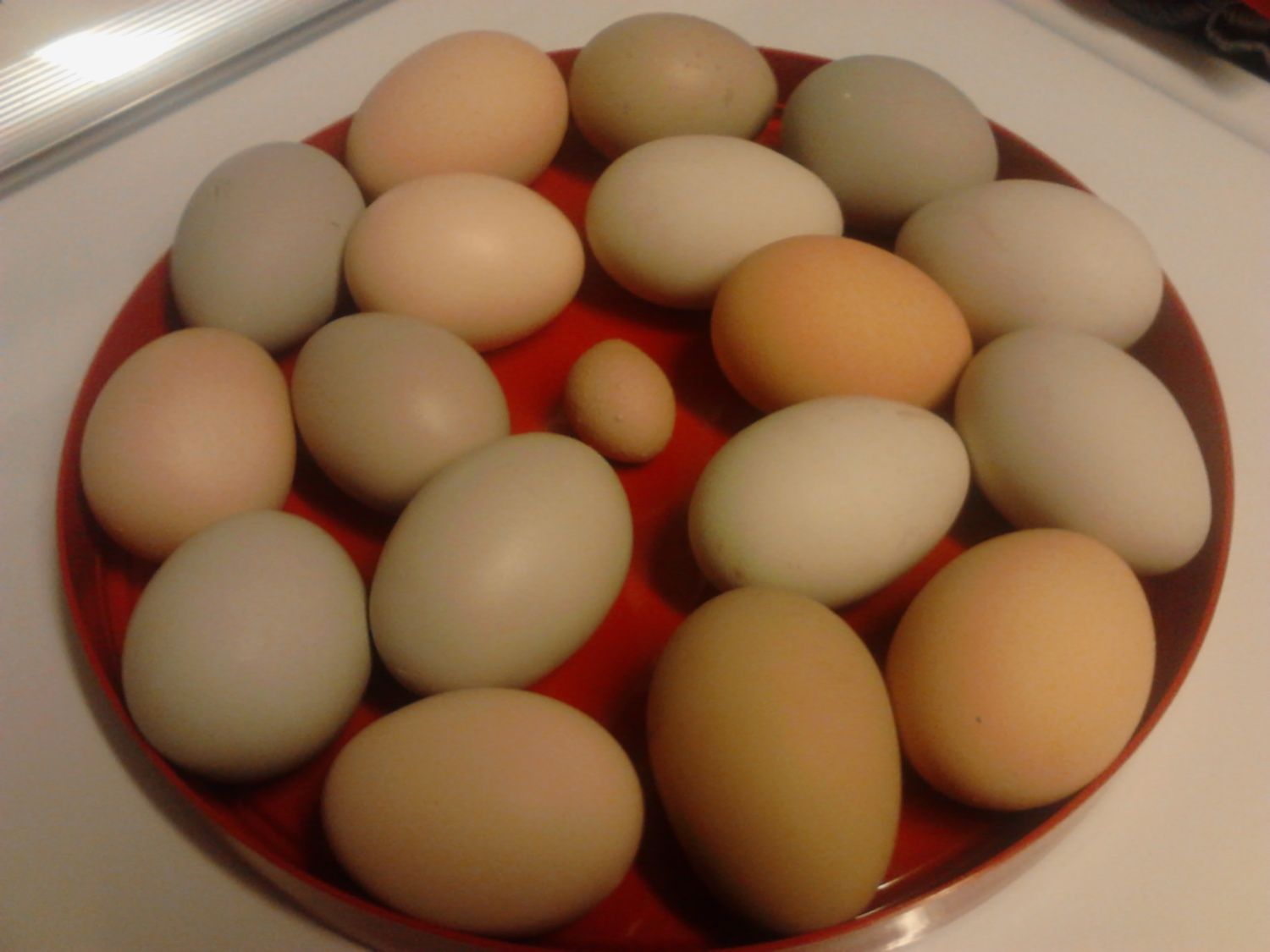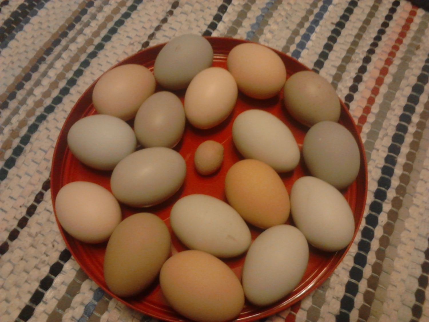 Got all different color eggs yesterday and was surprised to see the tiny one in the nesting box. I have found huge, double yolk eggs before but never a miniature one!