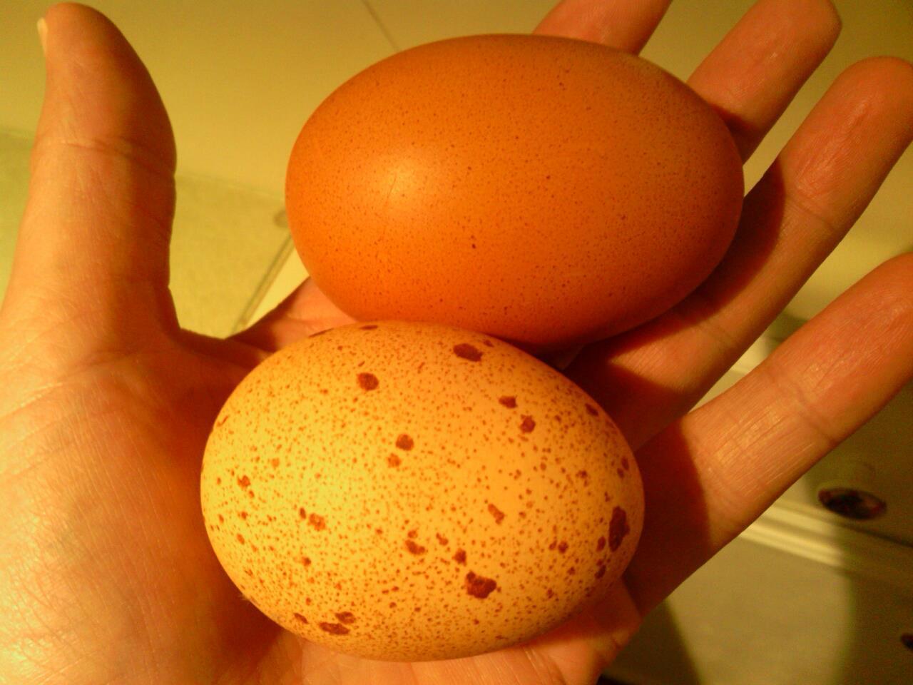 I know this isn't very uncommon, but it's still abnormal and I am very excited about it. My first double yolker from a Marans pullet that just started laying a few weeks ago! The comparison picture is an egg from a 2 year old Welsummer hen. My daughter got to eat it.
