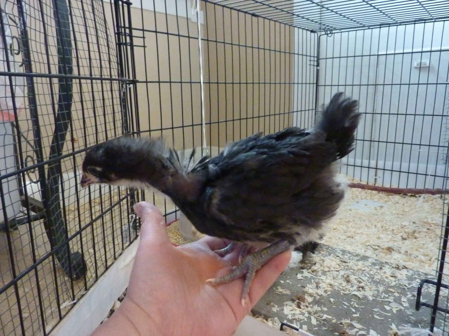 This is Solo. I cannot believe how big her feet are at 4 weeks of age! Incredible! She has slower feather growth than the other chicks so if you compare her to the others in her clutch, she just looks like a really big 2 week old baby! And she is very friendly. She will walk right into my hand.