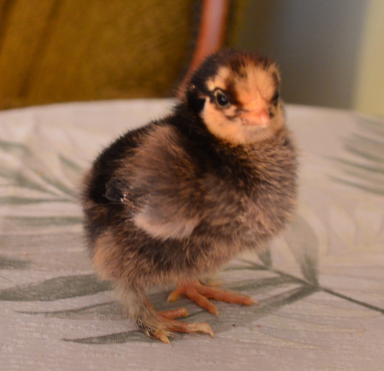 Silver laced cochin bantam at about 5 days old. Name is Zorro for now, but could be a Zena also. They are about 4-5 weeks now, need to take newer picture, he has some feathers now.