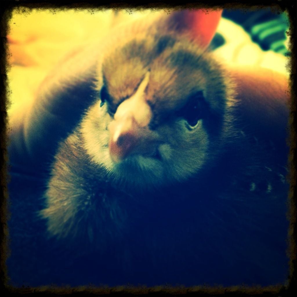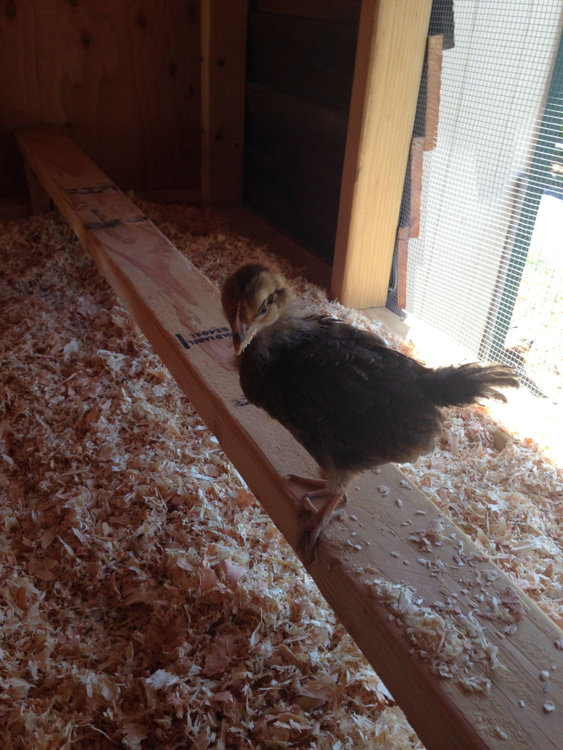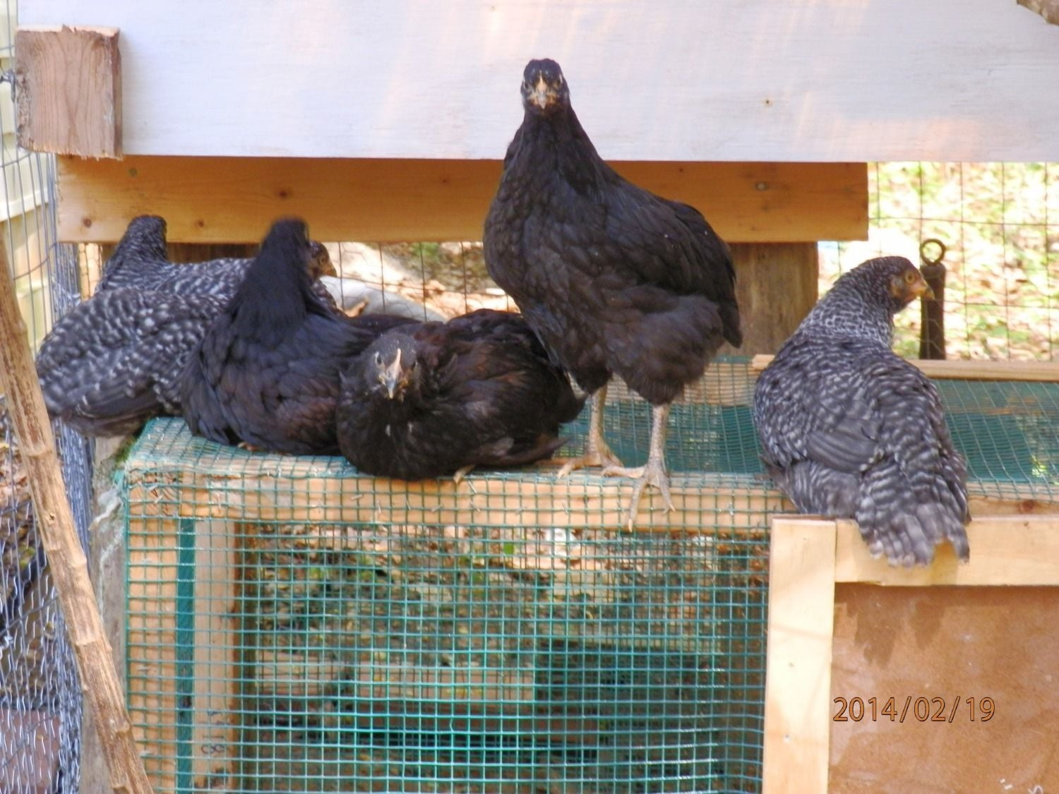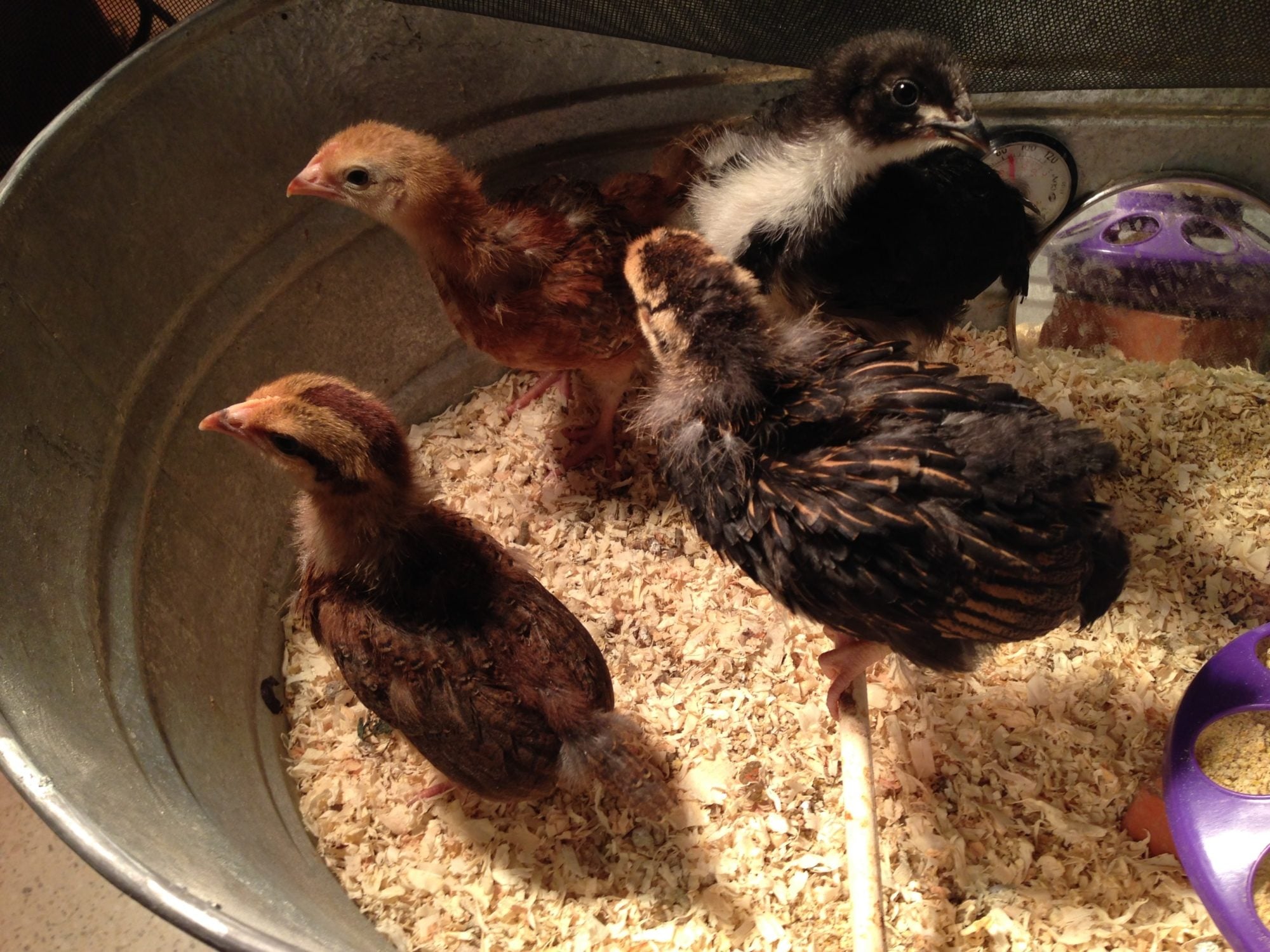 e chicks at 3 days; b:2 days after adoption by Stella; c:at 9 weeks old this week. Barred rocks, buff orps, Rhode Island reds, and americaunas.