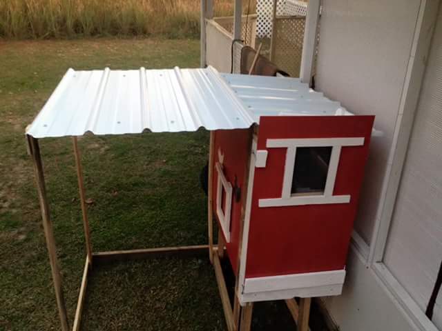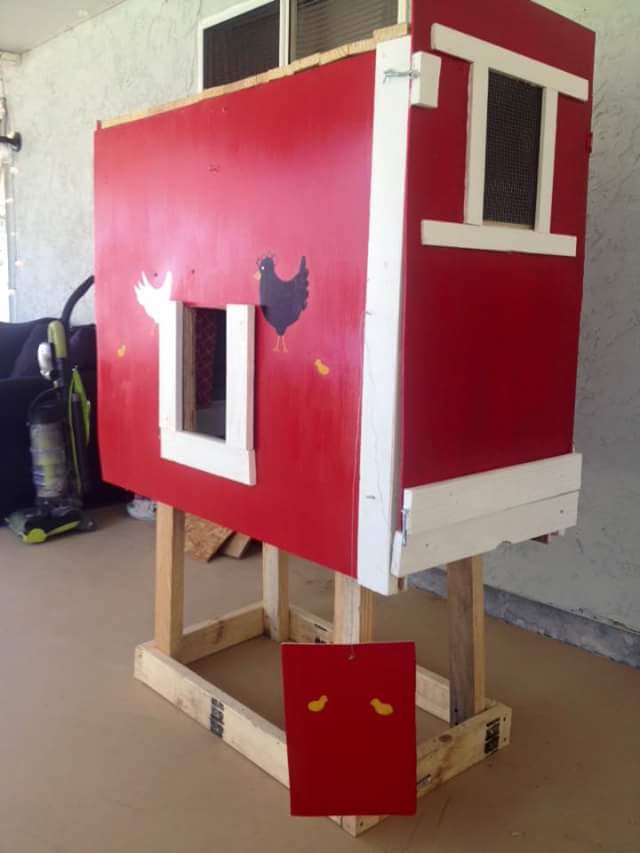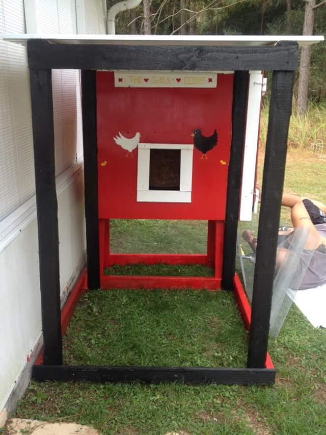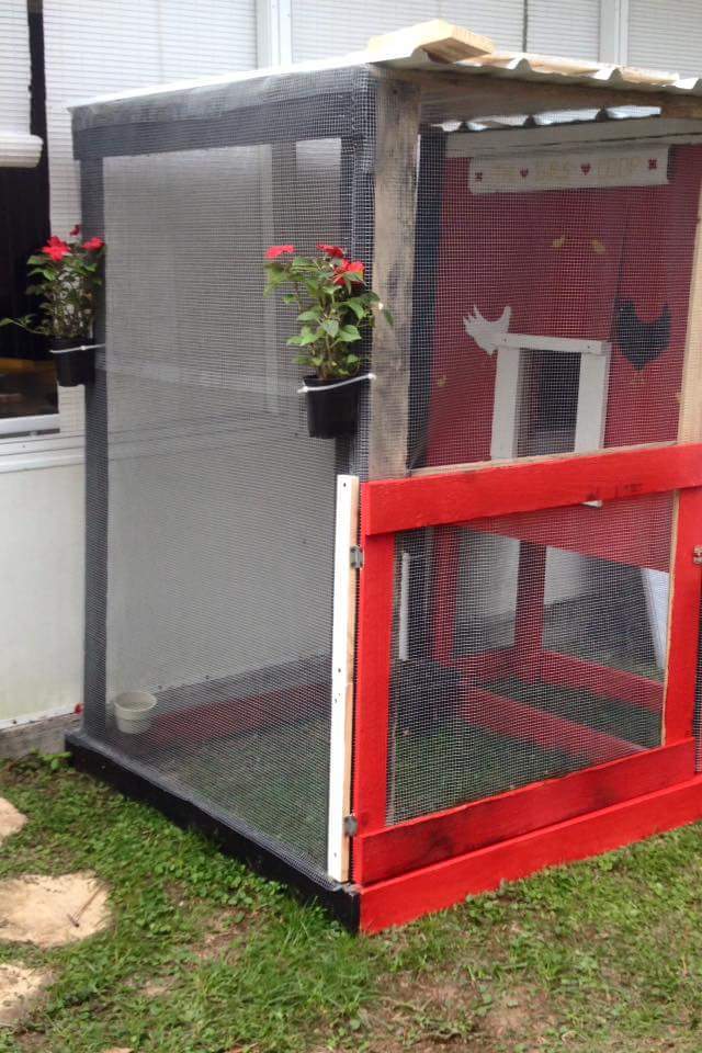 Our Chicks like their new home All made from wood pallets and metal roof from my hubby's job. His boss told him he can have as much wood or steel as he wants for free. We paid for hardware and screws and nails. The chicks are so happy. They played in the run for hours. Love how Piper is beginning to learn his name. Lol I did all the painting and art work myself. Lol