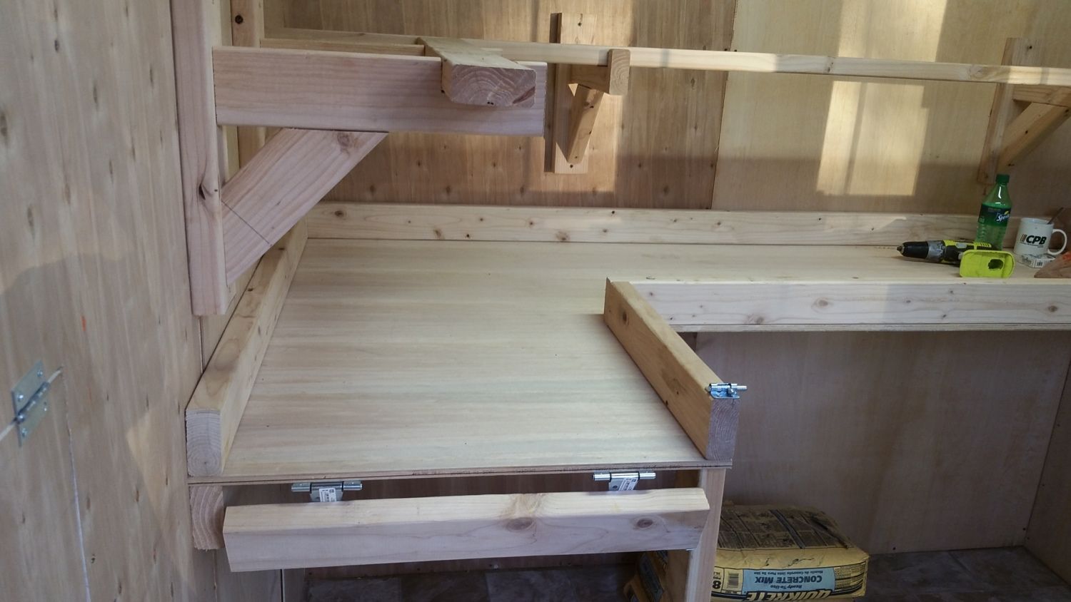 Built our coop from pallets I drove around and picked up. It has the run included all in a 9x11 space. The cantilever is where the roost and nesting boxes are located.