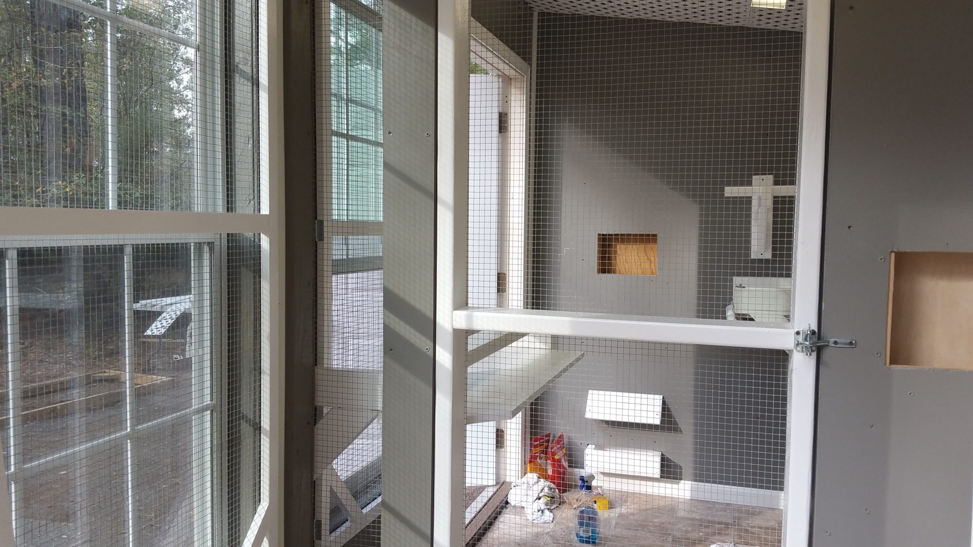 Do you have some type of ramp for them to get back up inside? or maybe a 1/2 way height step? That seems like a pretty steep angle they'd have to fly up to get inside. and a ramp in that short a length run would also be pretty steep for them to climb. Coming out, their glide slope will probably cause them to hit the screen opposite the pop door also... Have you seen this happen? Hope it all works out for you