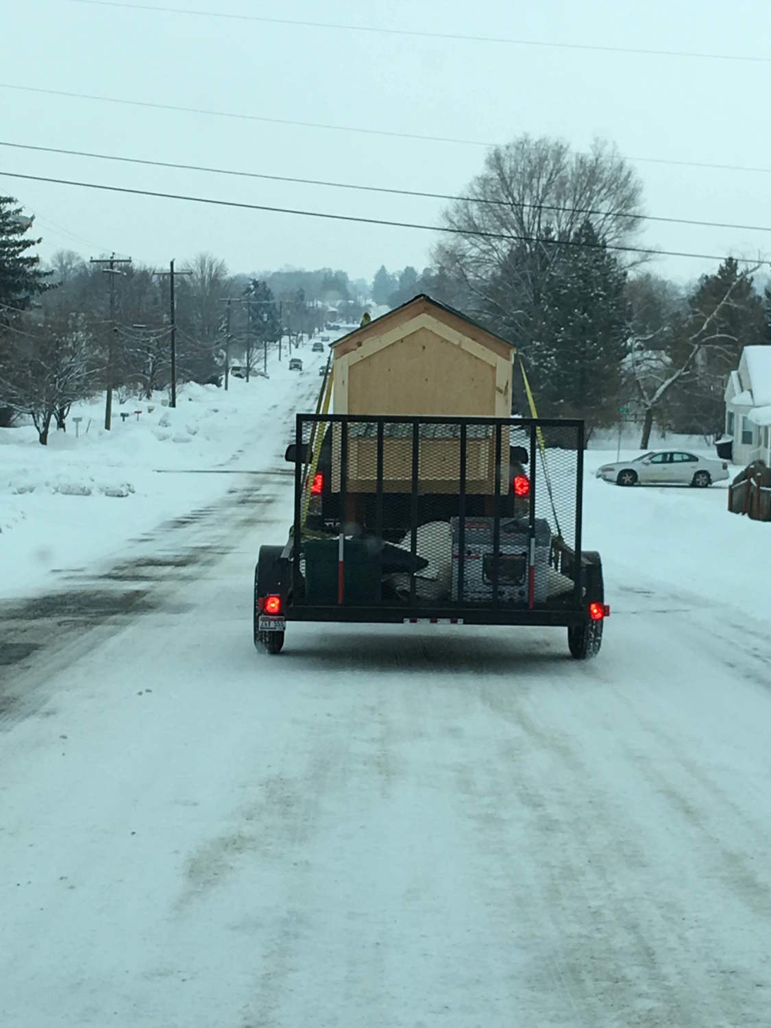My Brother in Law's dad finished my coop today. Moving it to its new home, sure hope this snow melts before March or I don't know how I will get it into my yard.