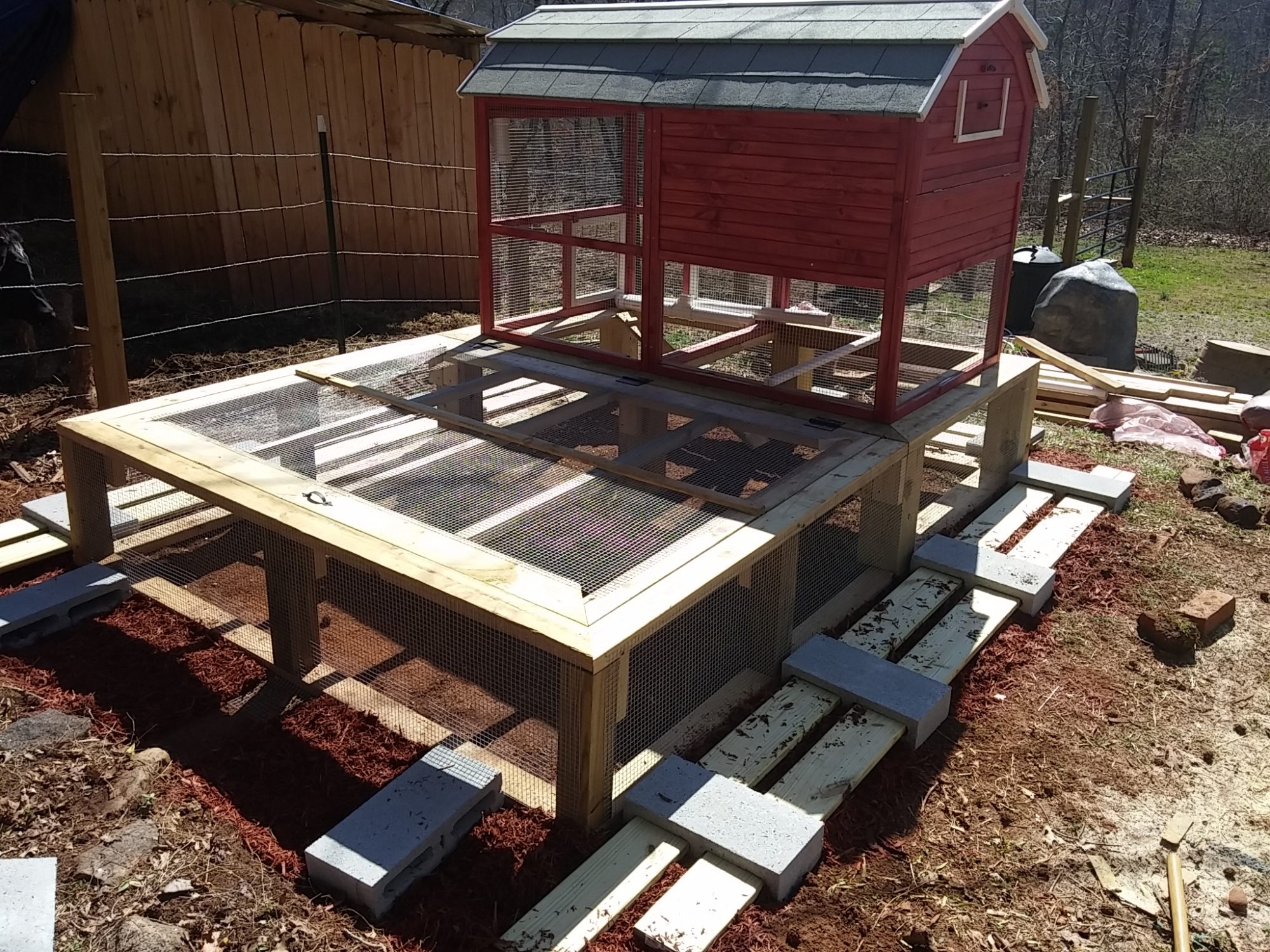 Hi guys. New to the Forum. Here is what we did. We took a prefab from TSC coated it in polyurethane and set it on top of riser/foundation. Hardware cloth surrounds run and runs under blocks and 1x6's. I plan on putting planters all around perimeter and if you look close you can see where hubby added handle so we can lift entire top of run to clean out. We have 6 hens on order.