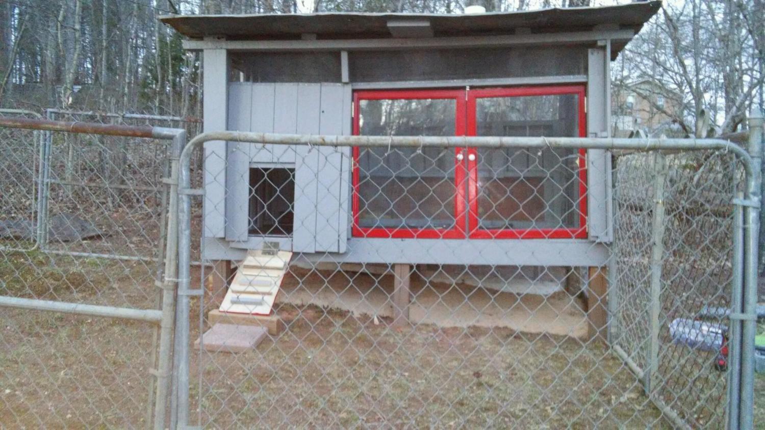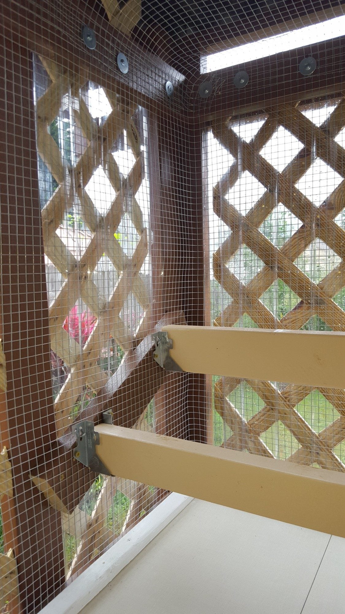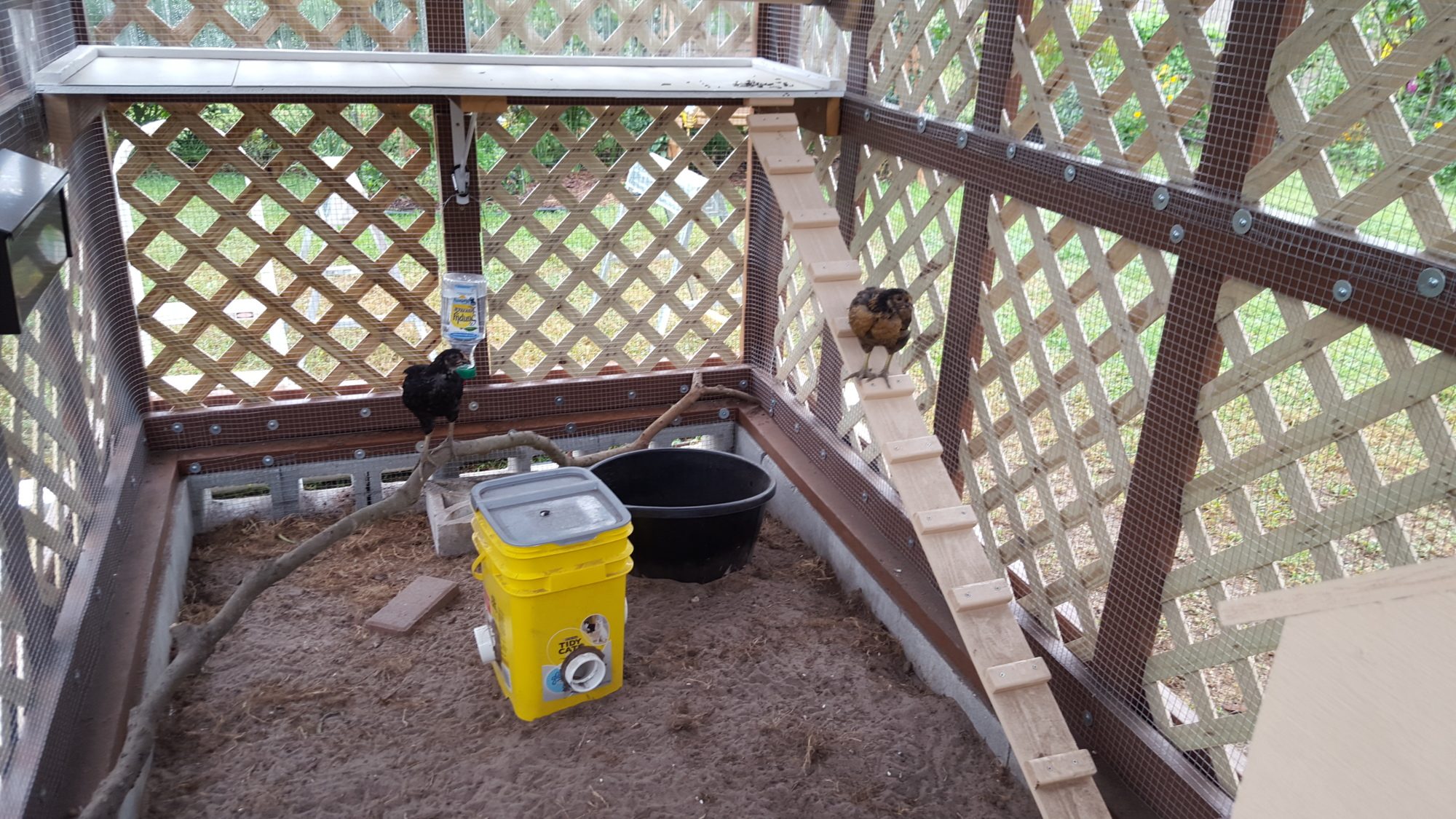 Their roost area is protected on 3 sides from wind and rain with Suntuff's clear polycarbonante panels and the roosts, droppings board, and ramp up to the roosts are removable for cleaning.