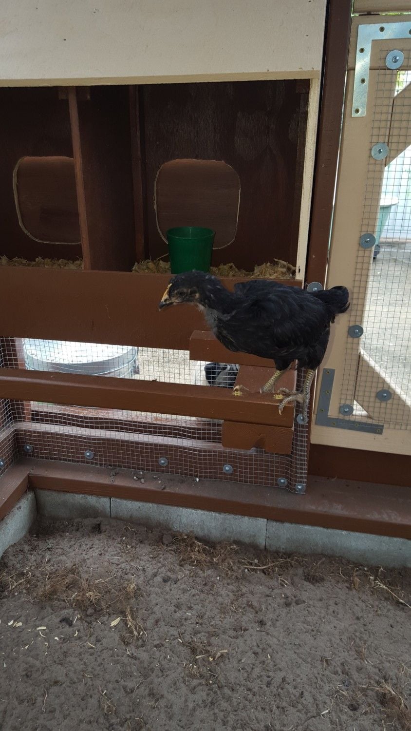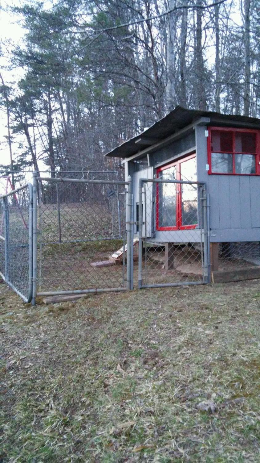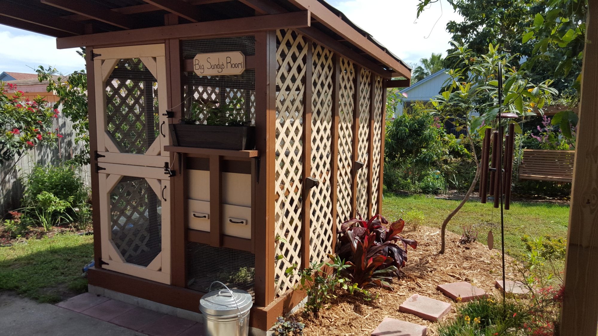 Their roost area is protected on 3 sides from wind and rain with Suntuff's clear polycarbonante panels and the roosts, droppings board, and ramp up to the roosts are removable for cleaning.