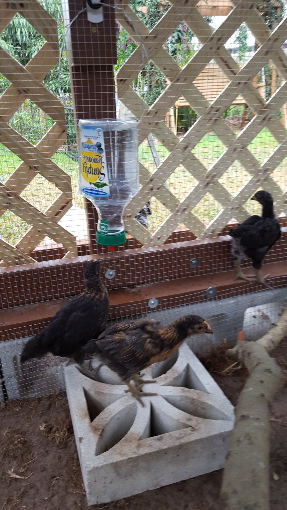 They have a home-made gravity feeder (that I hope is weather proof) and a temporary waterer until I get the rain barrel set up.