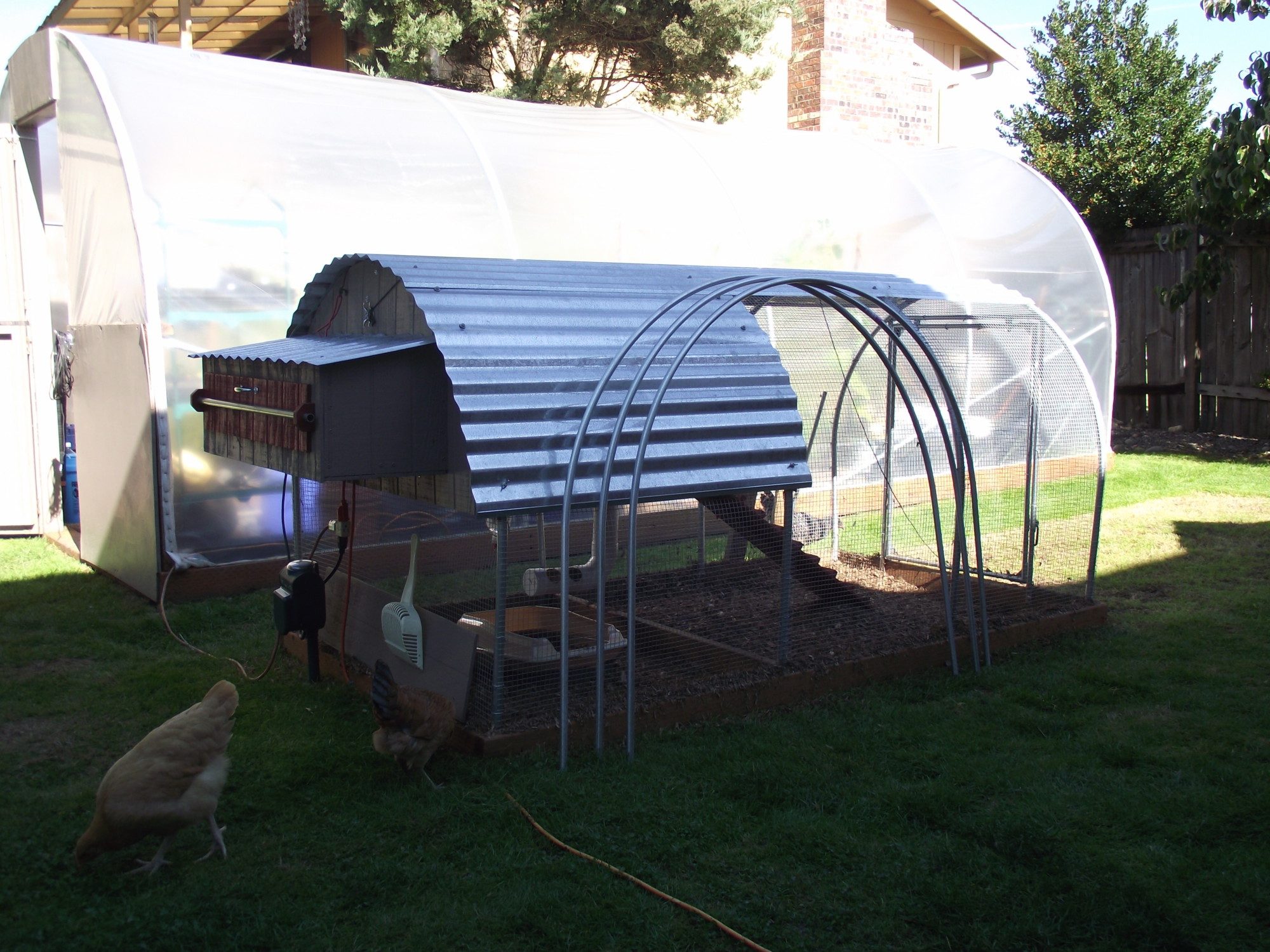 I'm very happy with this style hoop-coop (4' x 8') and all built from scratch. I was going to do an add-on to my hoop-house (greenhouse) because I had plans to put a rocket mass heater and thought I could keep both the hoop-house and coop at a decent temp during the winter. But decided to make a bender for EMT conduit to give me a 4' width instead of using PVC. Having 3/4" EMT leaves me room to insulate if necessary using either Tekfoil or sandwich material between the metal roof and plastic wall material.