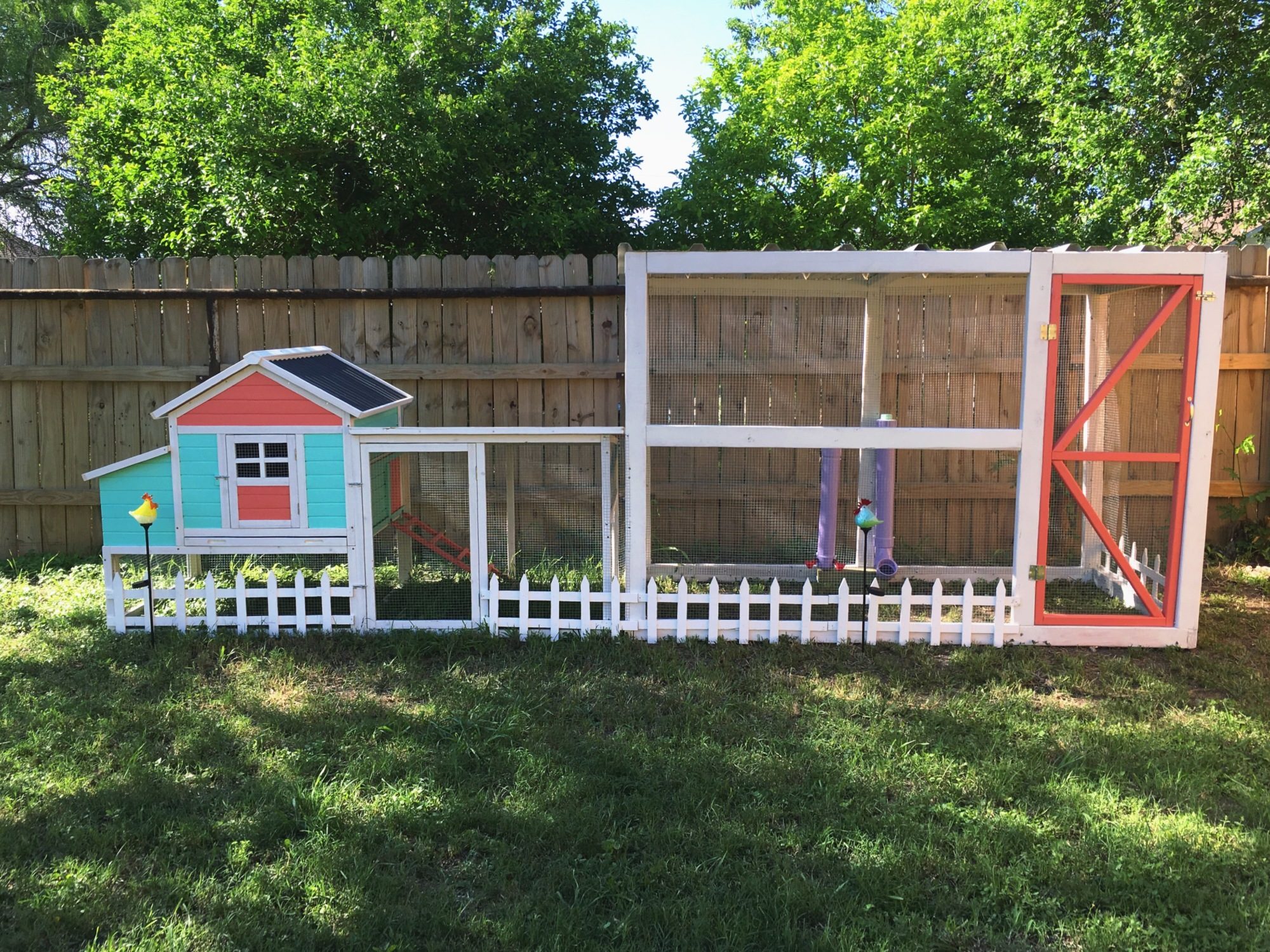 I made a PVC feeder and waterer with cups and painted them lavender. My hubs was also lucky enough to score some premium metal roofing from my FIL's roof remodel.