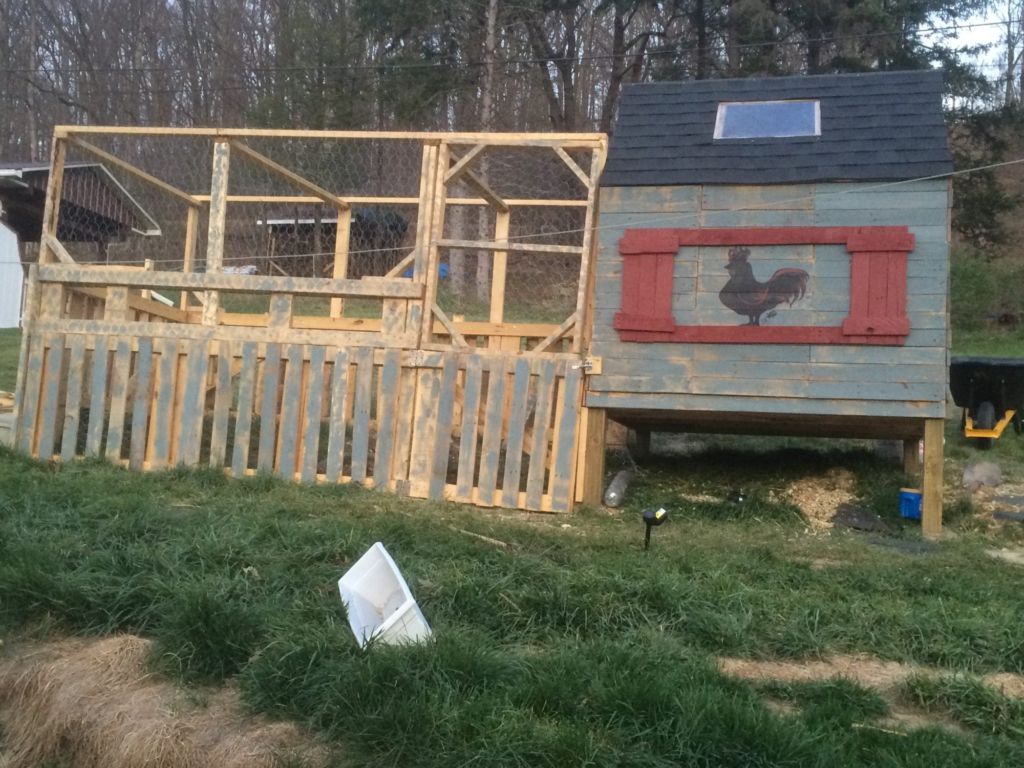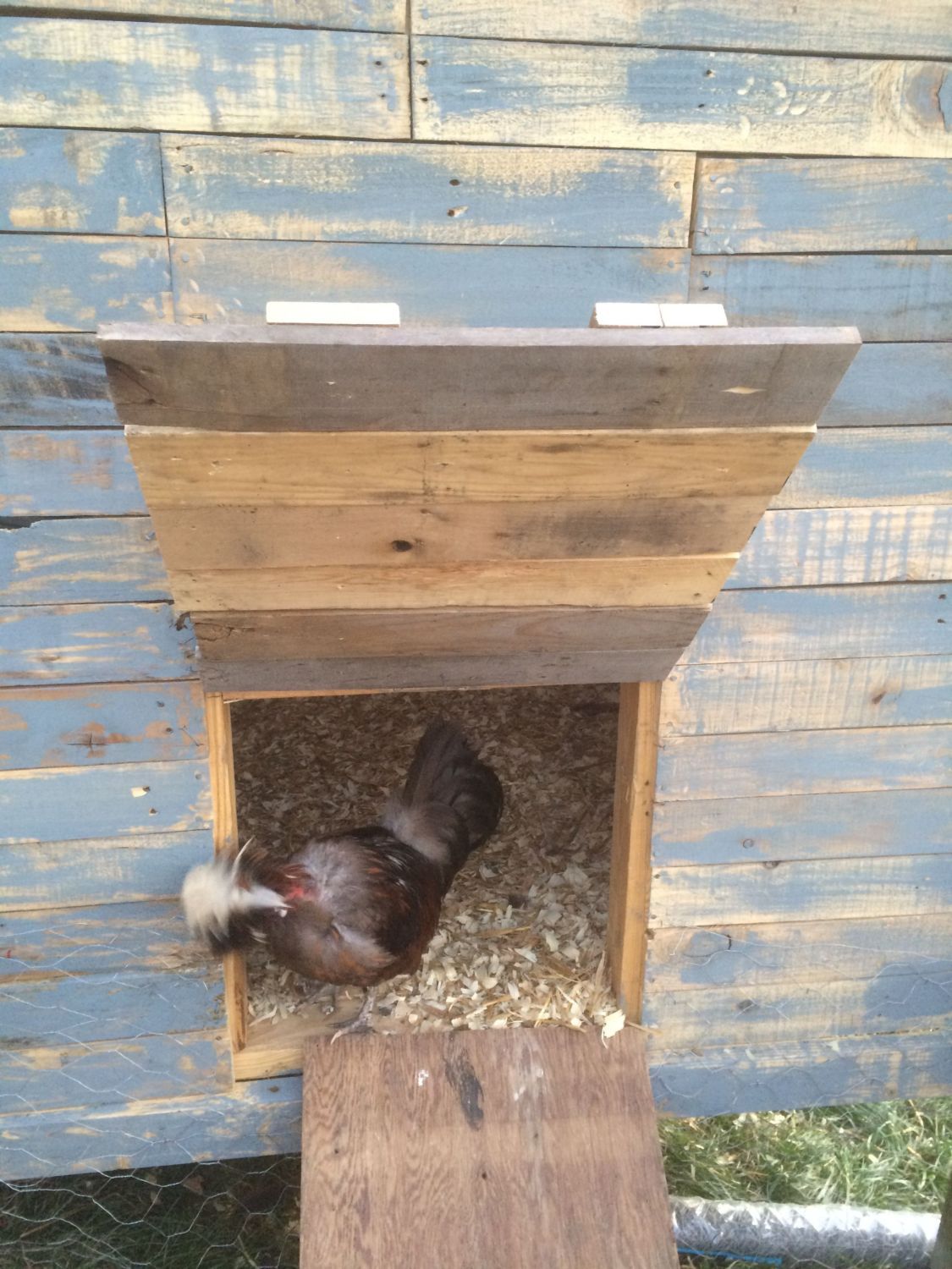 Hi all! This is my first year with chickens and I have to say that I am completely in love with them! Here is my DIY coop made completely of repurposed wood, mostly from pallets, a few left over shingles from our new roof job on the house and 2x4's we had stashed away. The rooster was free handed by my neighbor, Myke. I love my coop!