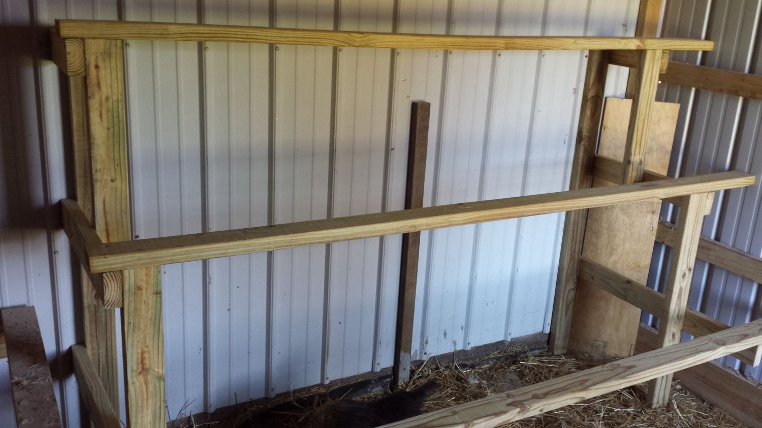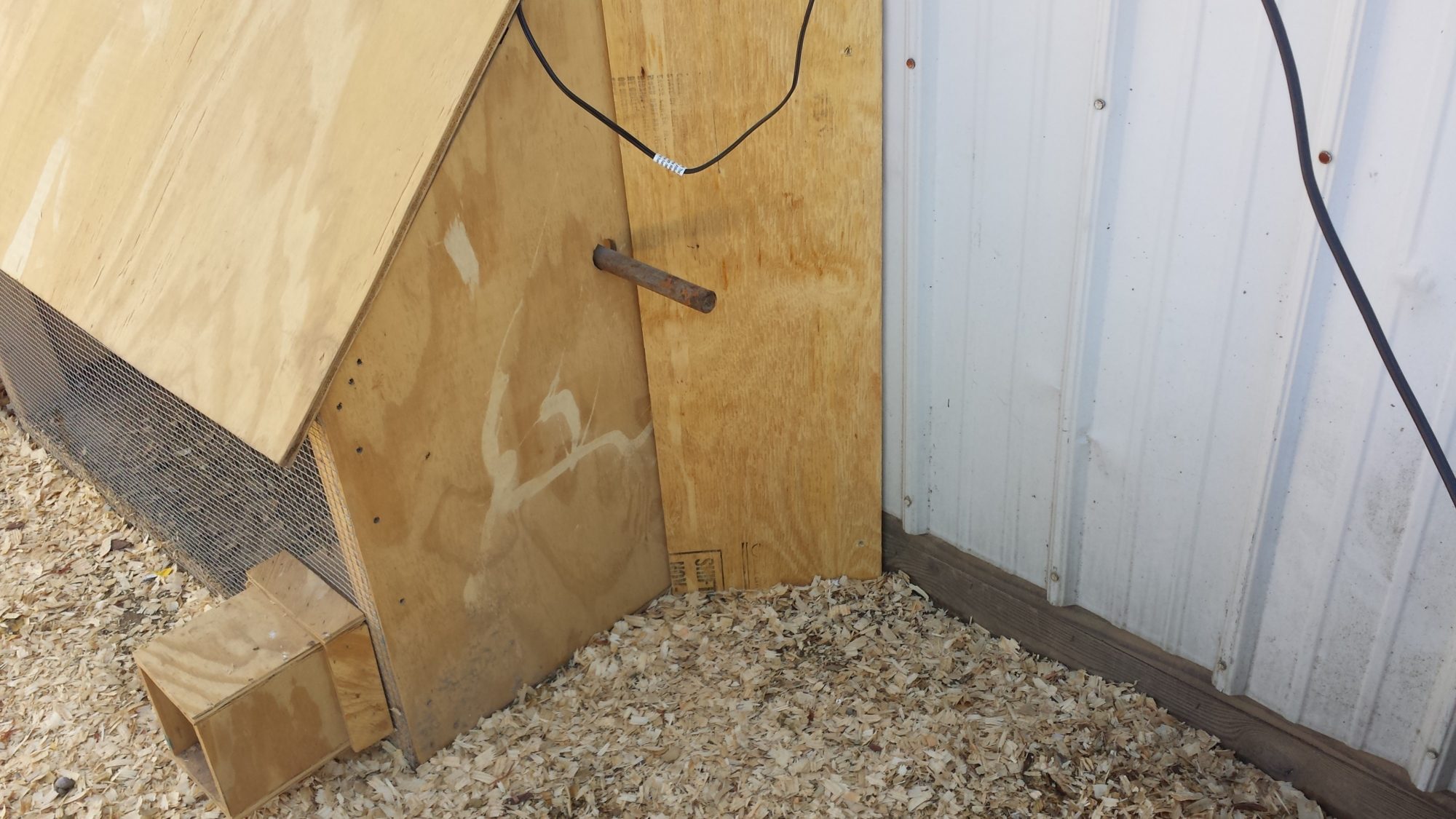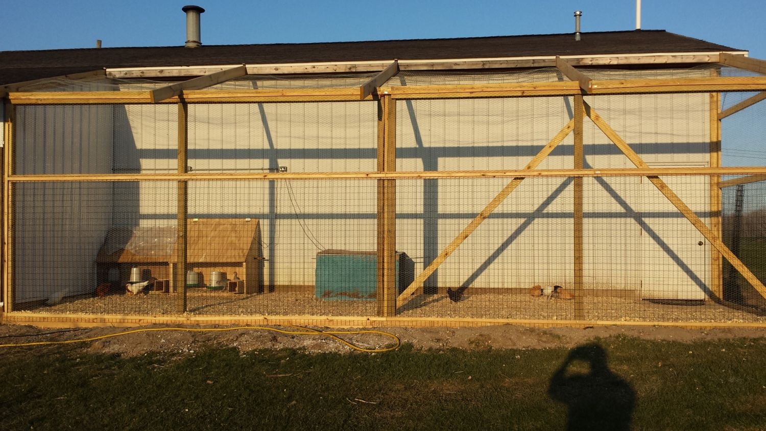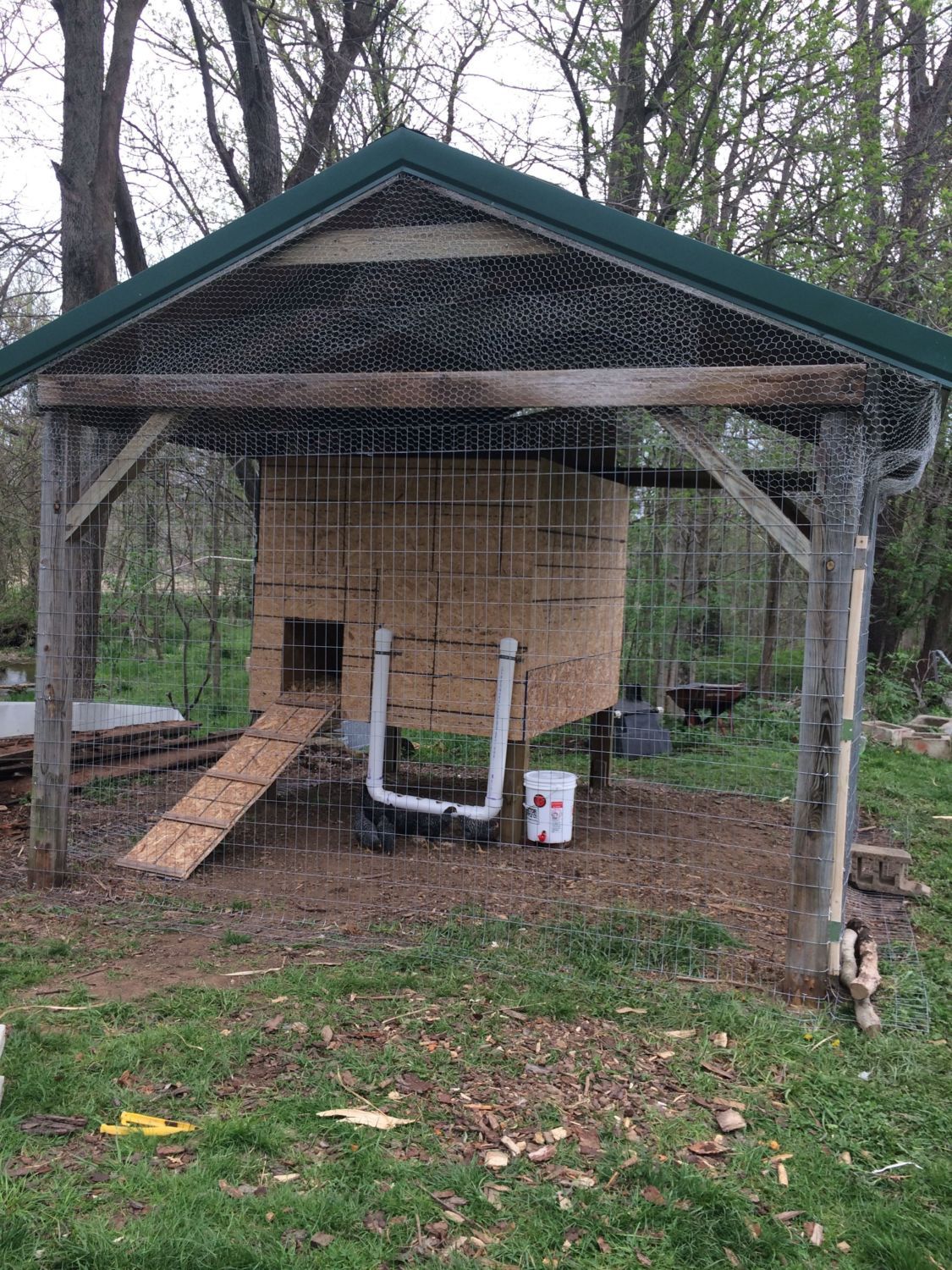 ) It's covered over now but I used hardware cloth around the perimeter about 2' to prevent digging, another idea I got from this forum.Some of the corners will be removed when I fully integrate the chicks with the hens since I will be removing the brood pens. I may just re-arrange it so I leave the larger plywood pen in place for future use but it will have to be water proofed if it stays. Still have to finish furring some of the outside wire ends etc. but otherwise I'm just about done. Decided to leave the roost in front of the nest box since they can all get up on it and the other design would be too high (for the nests). Only thing left to do, later toward fall, is to add the sliding barn door to the run for cleaning and maintenance access. When I do that I may switch the coop door to the side, inside the run for easier chore access etc.. I'm waiting on the sheet steel for the end of the run to further ensure my privacy and prevent any snoopers from turning me in. Once that's done I will feel much better about the project and anyone asking about my chickens will have to have a warrant to see them. It will also dress up the end of the run to match the barn and look nice from the road. The happier I keep my neighbors the less trouble I have. (another reason I don't own any guns, cant shoot strays, thus angering the neighbors, without a gun