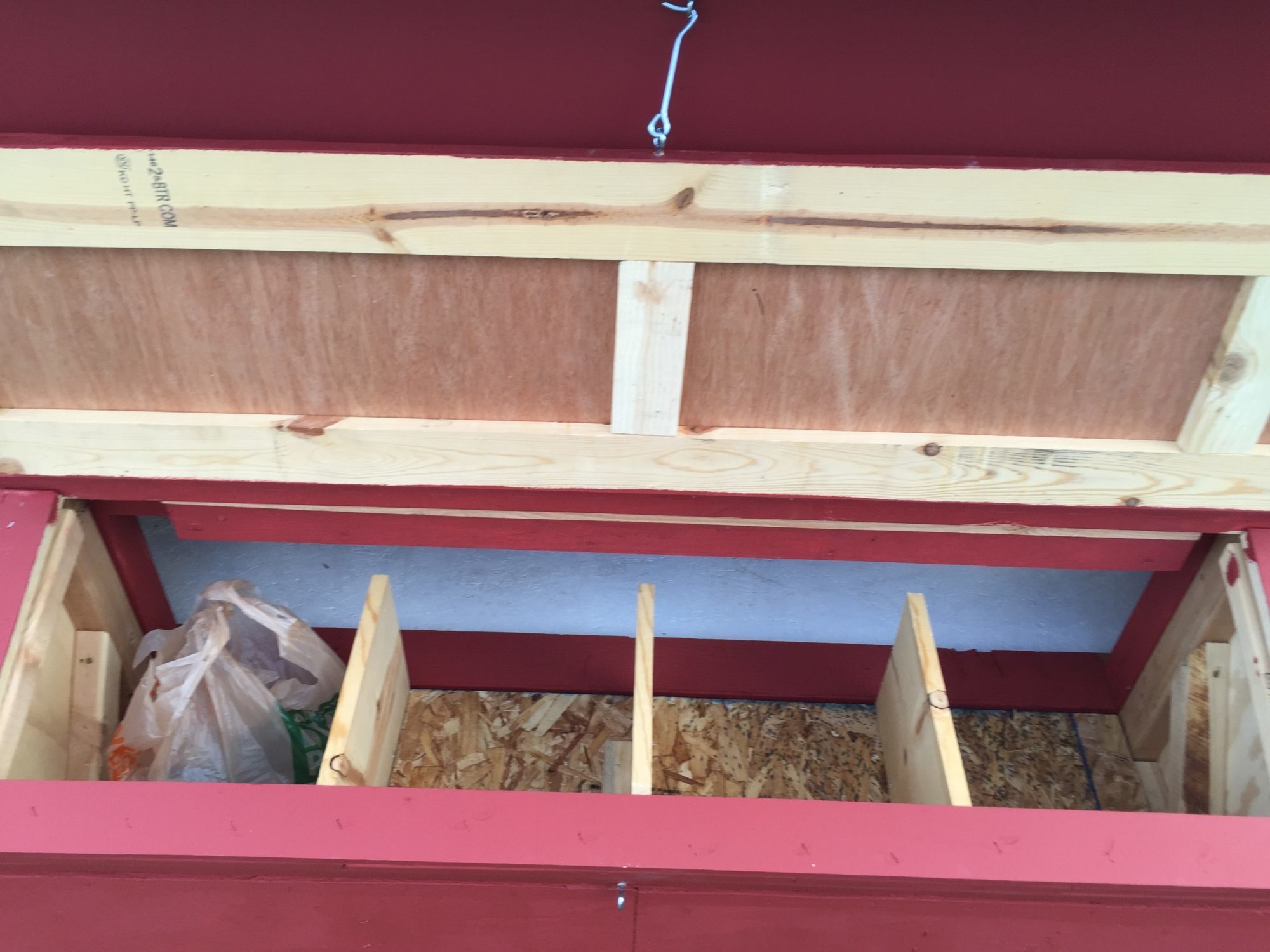 Paint here shows well how the nesting box detaches. A french cleat on the top, and two lag bolts on the bottom hold the nesting box on. The large door you see on the left is my cleaning access, and if I need to get in. I saw others that are having a hard time mucking the coop out, I hope this makes that easier.