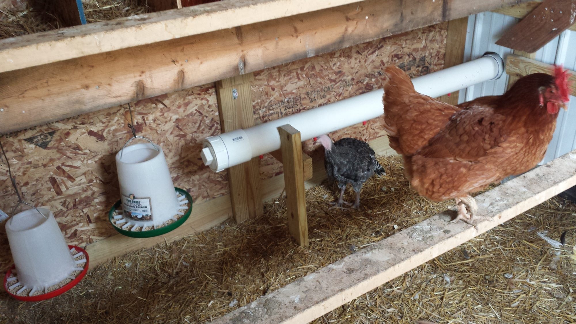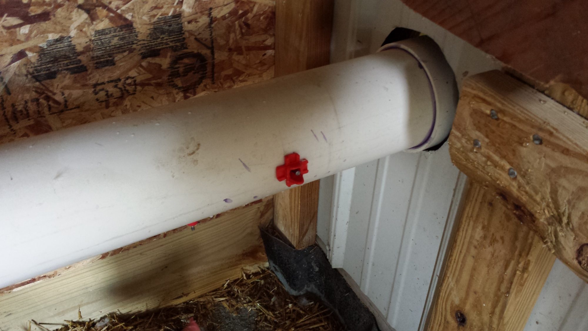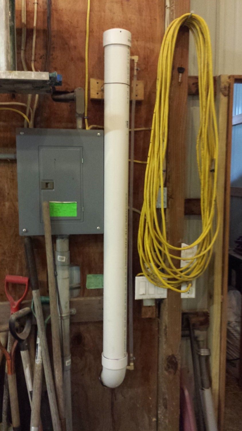They just stepped off the perch onto my back like they owned the place. The assembly is made of one 10' length of 4" pvc with one 90 degree elbow connecting 2 halves (5' each) with a non glued cap for filling and threaded plug at the bottom end for cleaning as needed.
