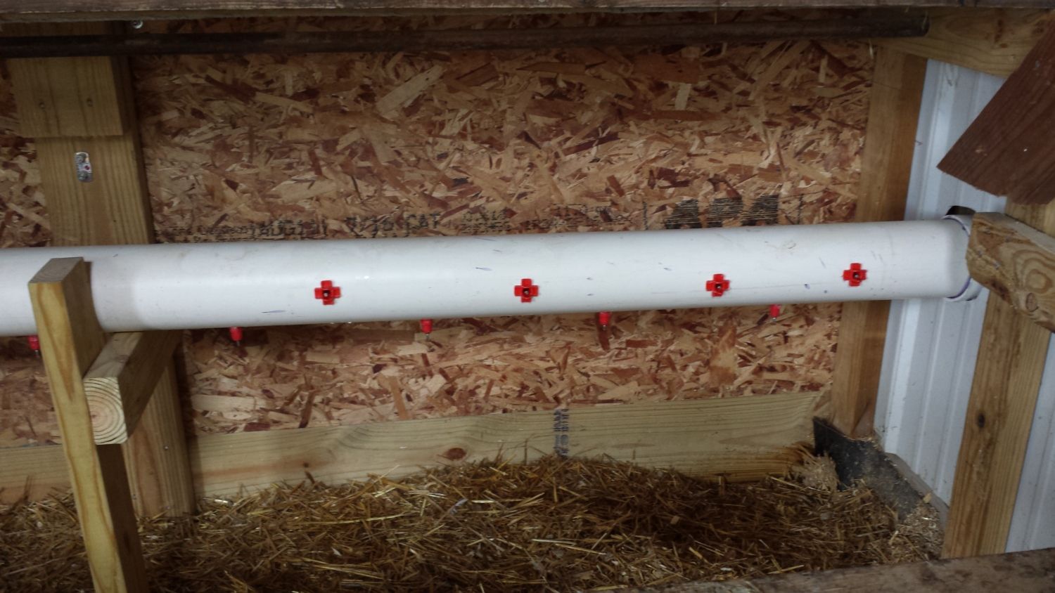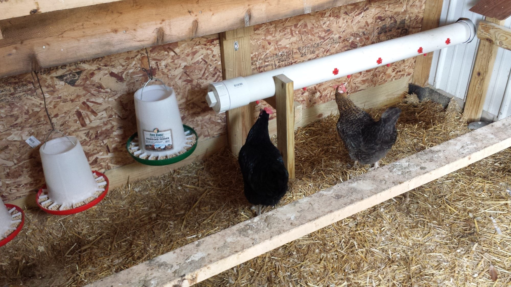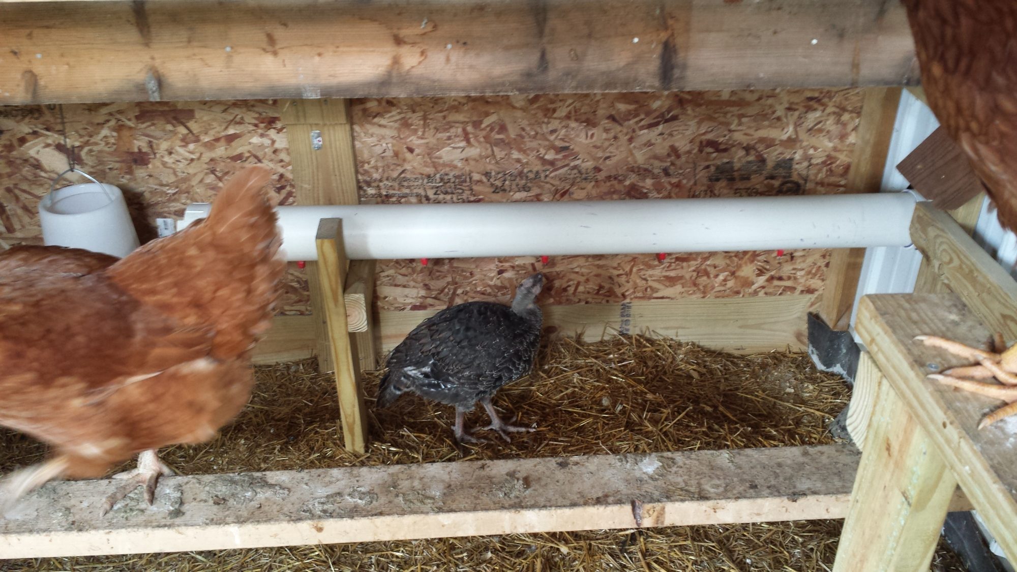 They just stepped off the perch onto my back like they owned the place. The assembly is made of one 10' length of 4" pvc with one 90 degree elbow connecting 2 halves (5' each) with a non glued cap for filling and threaded plug at the bottom end for cleaning as needed.
