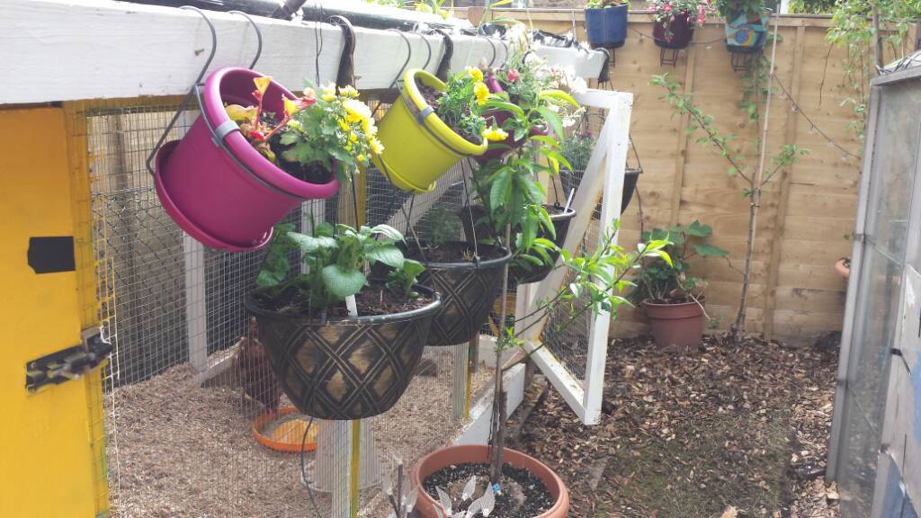 Got this coop secondhand, added various veggies to the roof and some wildflowers, painted it egg colour, and added a pipe leading from the roof plughole to a water butt - going to turn that into an automatic watering system. It was VERY hard work to assemble, especially since my garden has no road access and very narrow doors and hallways to get through in the flat - and there were no instructions. Designed by an architect who lives across the road, cost £70 :) Very handy being able to collect onions and salad at the same time as eggs.