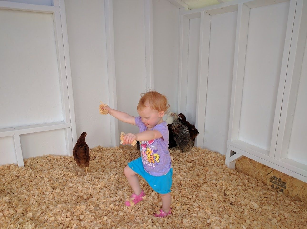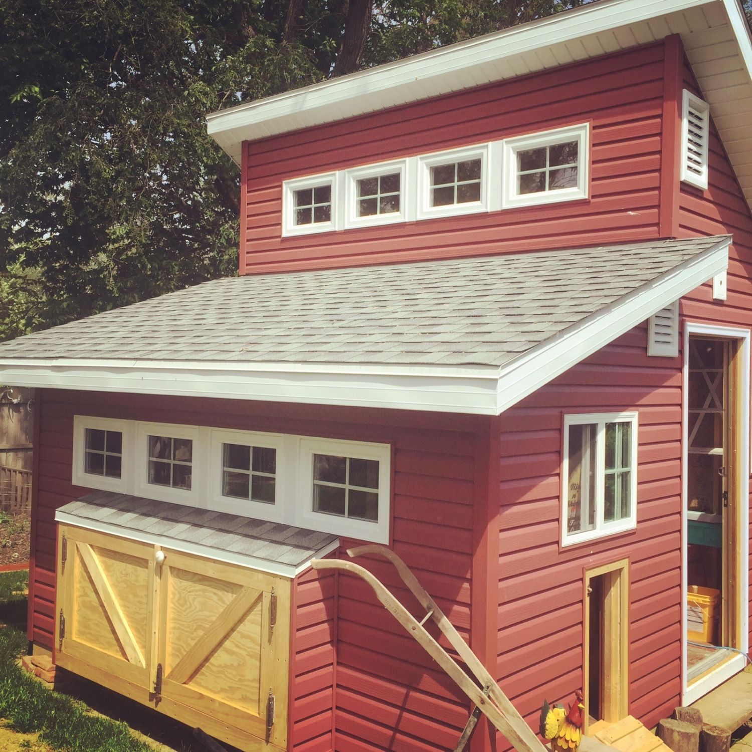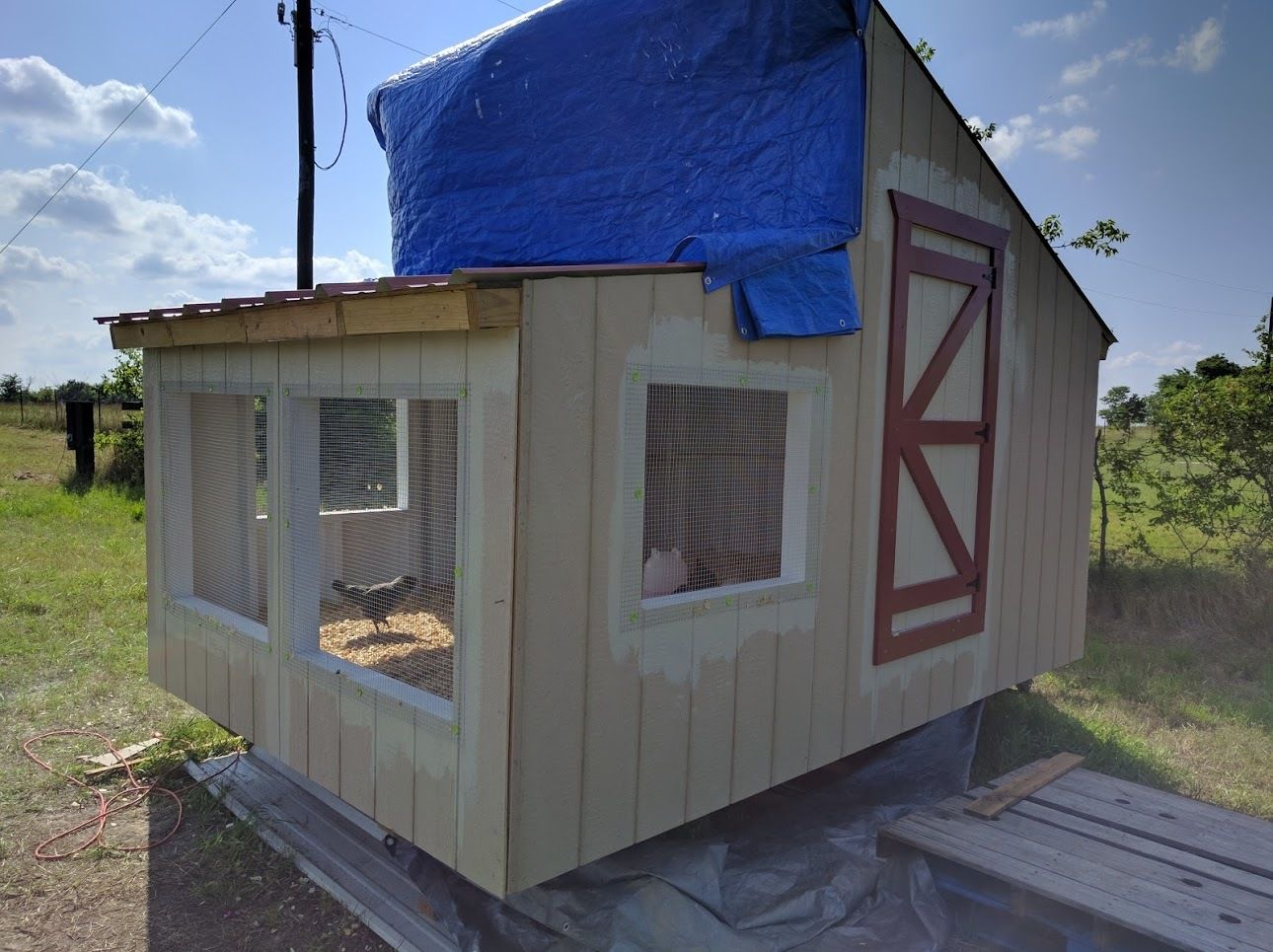 Looks great, but get that heat lamp out of there. At 10 weeks old, they don't need it, and it's too close to the roosting bars for safety. Feathers are highly flammable, and all it takes is one over excited chick to set everything on fire.Here is our coop, my hubby designed and built it into the former granary stall of our old barn. It was quite an expensive undertaking that is for sure, but it's super-safe, easy to clean and insulated. (note, it's not completely finished as we still need to add the nest boxes in the wired-up opening to the left side) but since our chicks are only 10 weeks old we still have about another month to go I am sure.