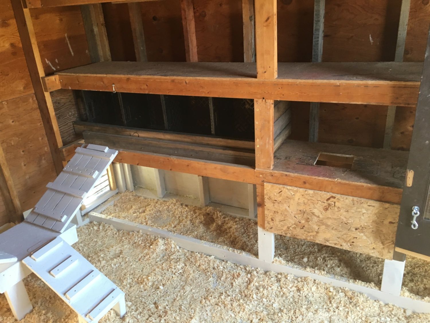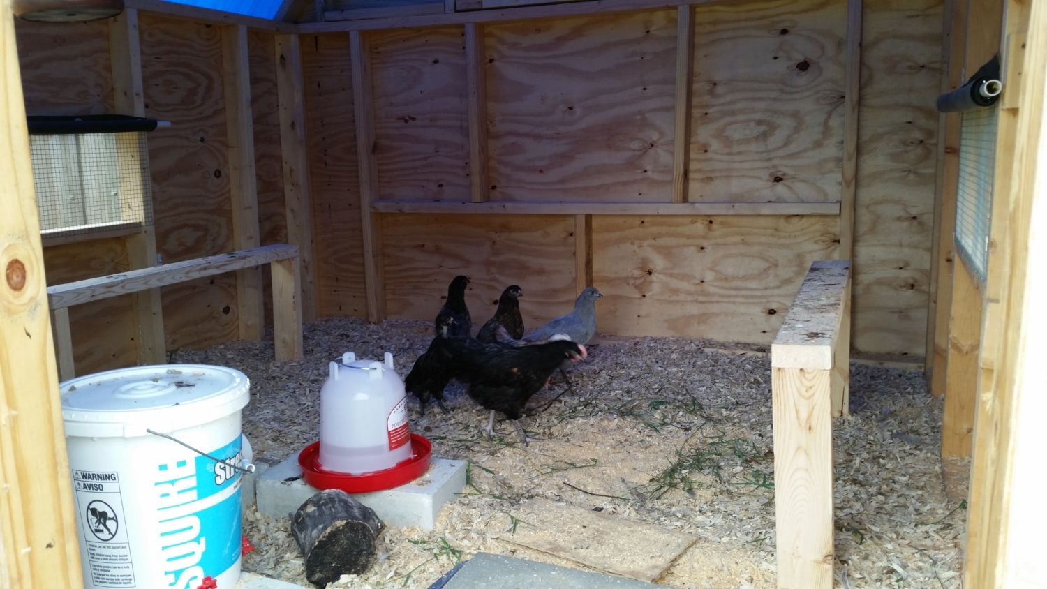 Question: How long do we need to keep them in their Coop at first & can we let them out in their attached run in a few days? We put our 12 Cheeps(almost 5 & 6 weeks) in their Coop for the first time! Not great pics, the sun was making the light all weird. We will prob add another roost, stagger it a little lower, but just needed to get them in there & used to their new home. Finally out of our Garage, yay!! We will add a droppings board & will put the nesting boxes under that on the floor, sitting on 2x4's. Food & water is in a corner sitting up on a wooden type box, just up out of the shavings. Also, will we need to build a ramp for the roost?