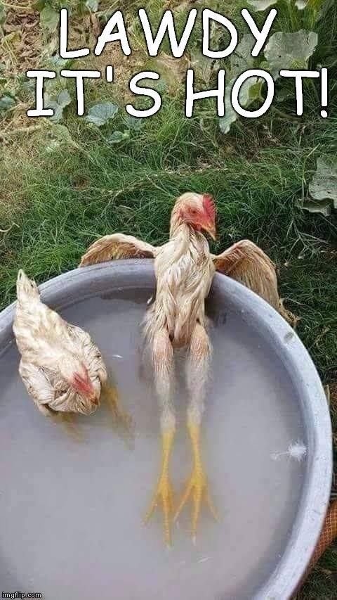 Here in Central Florida we r running 93 with a humidity of 70%. All you do is walk outside and you are dripping.I dipped 18 chickens in a 5 gallon bucket of water today for the first time. I was afraid the fan and ice bottles and solid shade just were not enough. They were very sedentary compared to usual. The bucket worked. Bo more panting or droopy wings for the rest of the afternoon