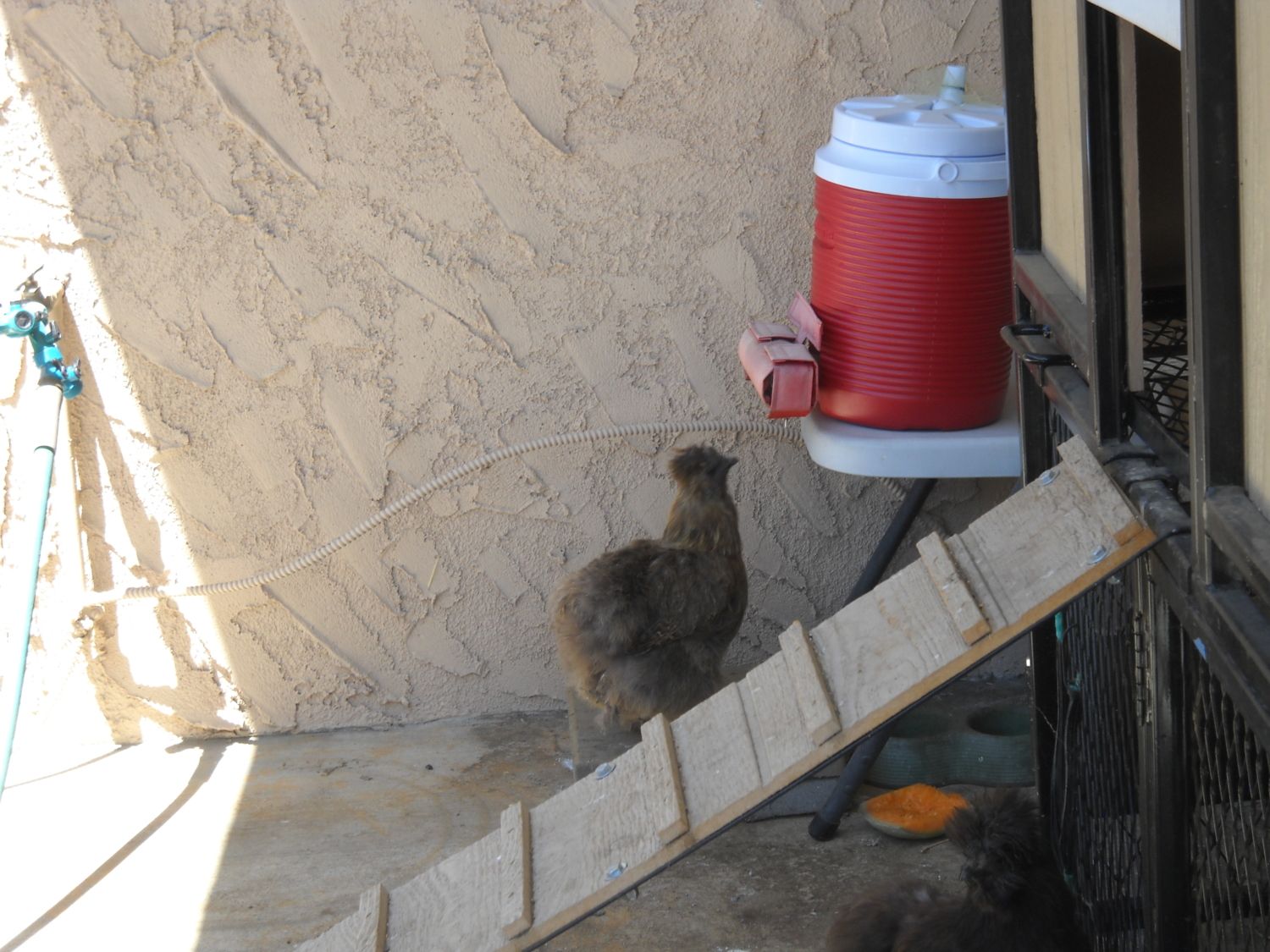 The coop is shaded under a patio roof where we moved the red portable Brite Tap water jug: