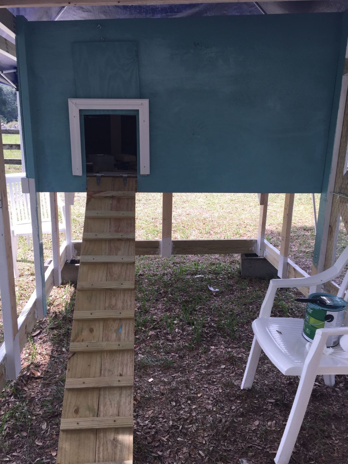 You all did a great job! Your frame/door looks nice and secure.We were on a budget so I didn't want to pay for plans. I searched and searched for a design that I liked and then we just winged it. I wasn't planning on painting it but the kids wanted to so I found some leftover paint and let them have at it. I have some fine tuning that I need to do (I have no clue where to put roosts, or how many and I need to make my hen box into individual little cubbies. But the chickens seem to like it as is