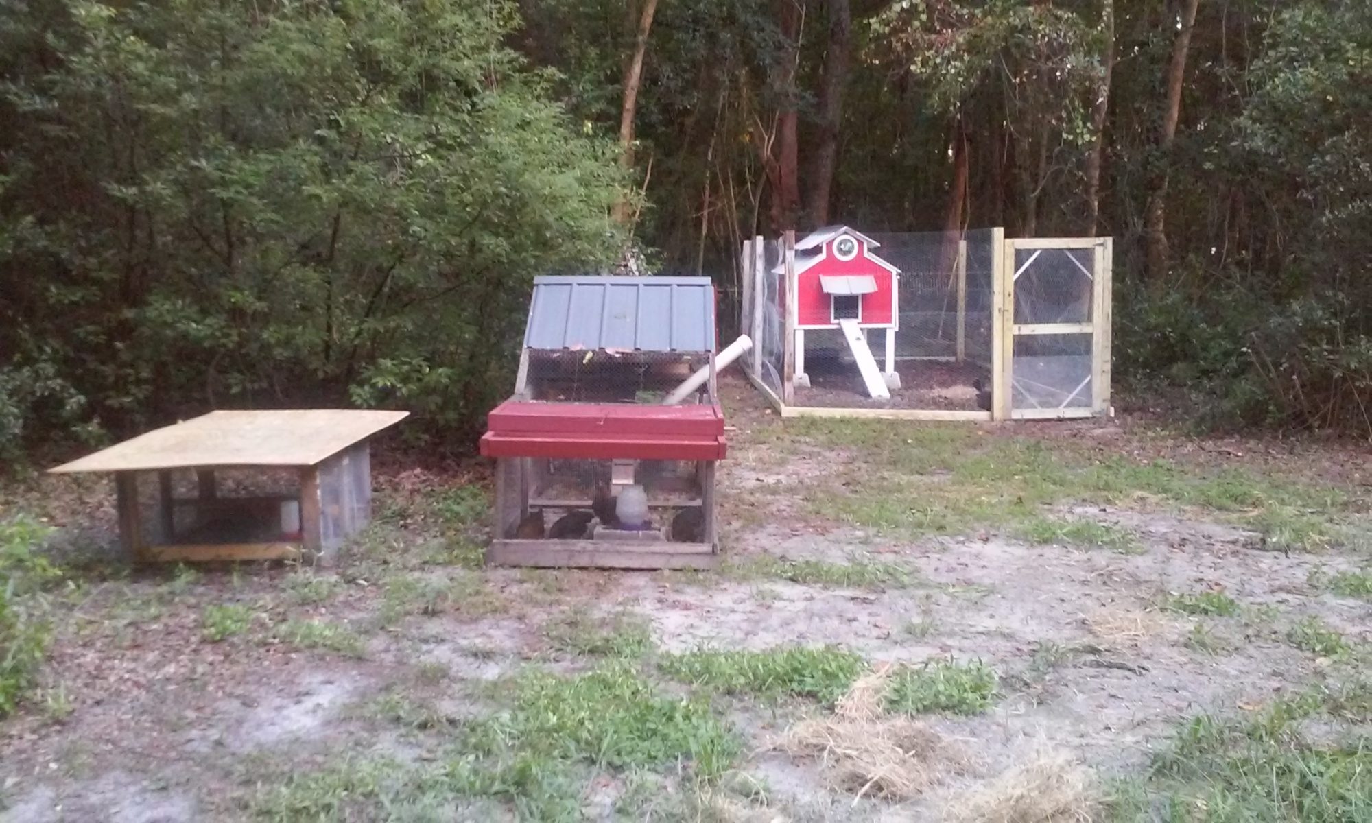 This is the newest coop I've built. I started with the chicken tractor in the middle, it now houses my 4 juvenile (4 month old) Black Sex Links. The smaller one on the left holds 3 little Buff Orpingtons less than 3 months old and the bigger newest coop houses the 2 laying hens, a 2 year old black sex link, Ginger, and a 1 year old Buff Orpington, Blondie.