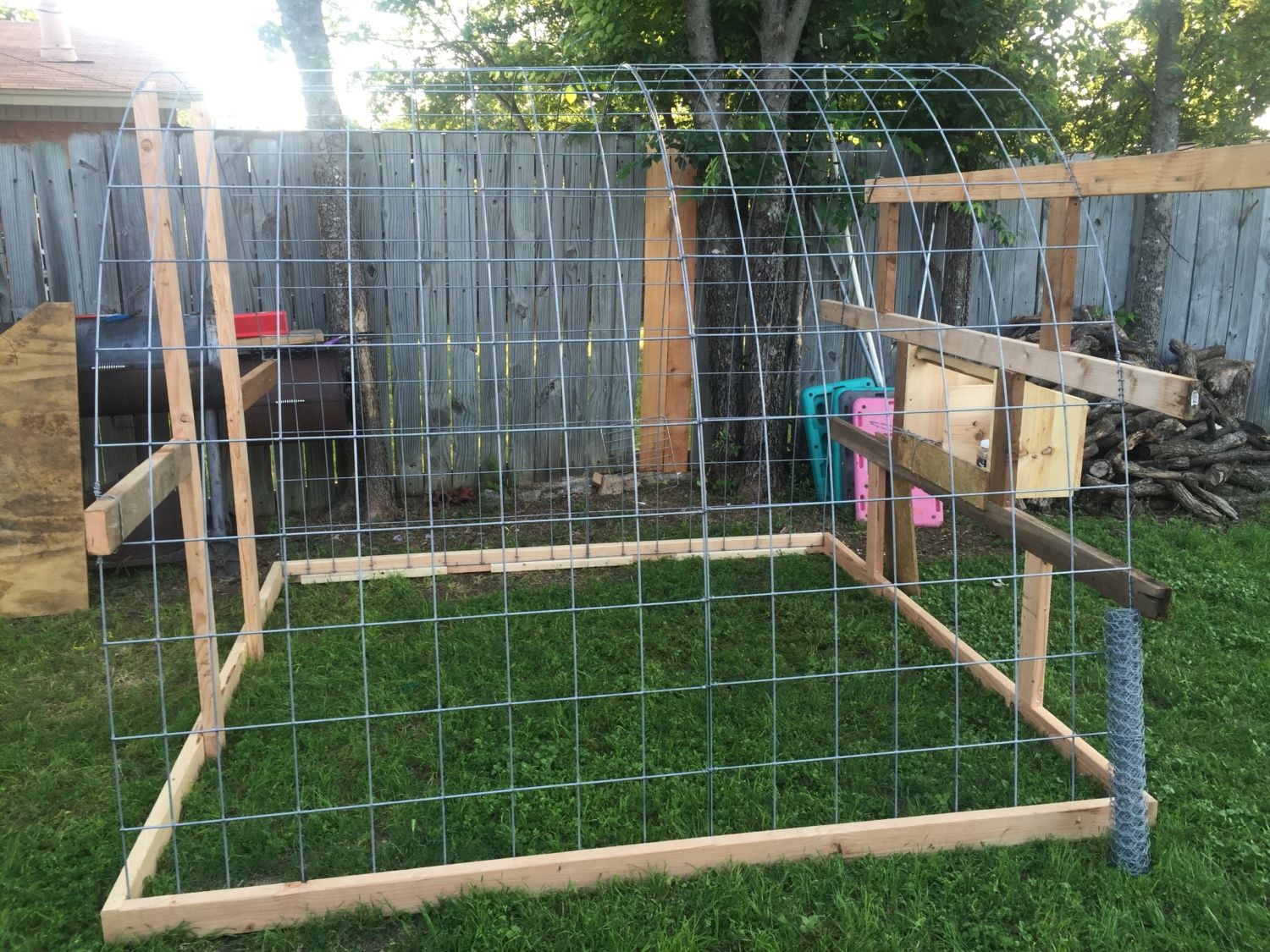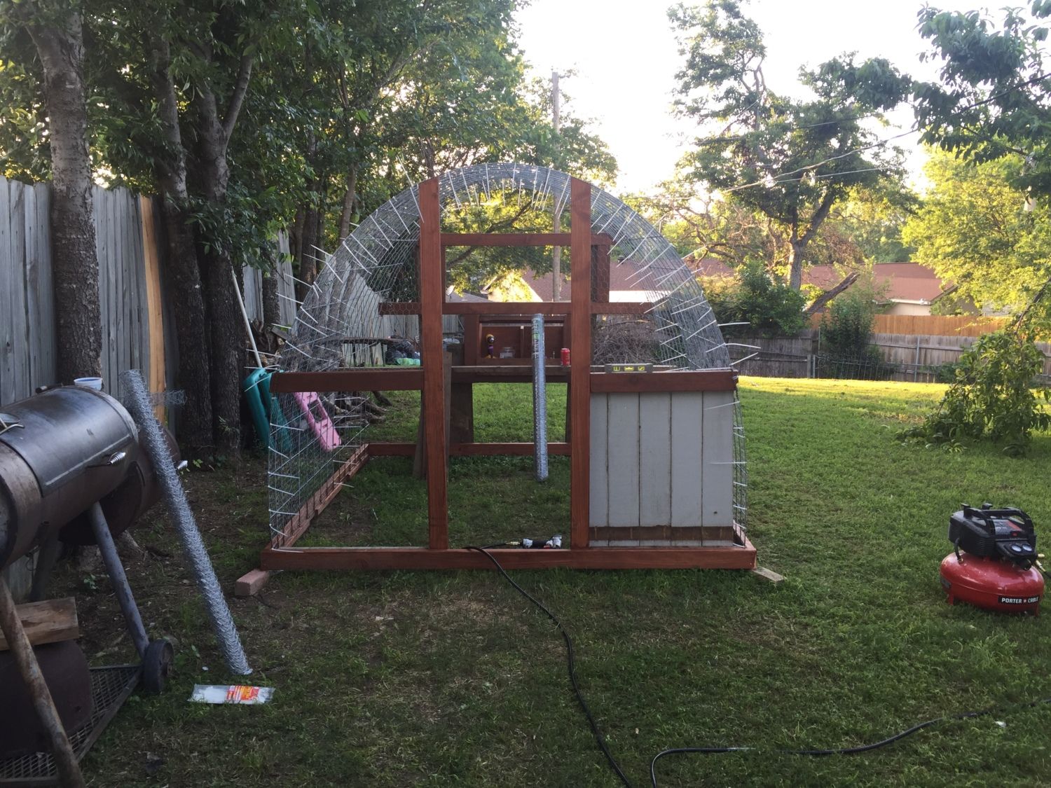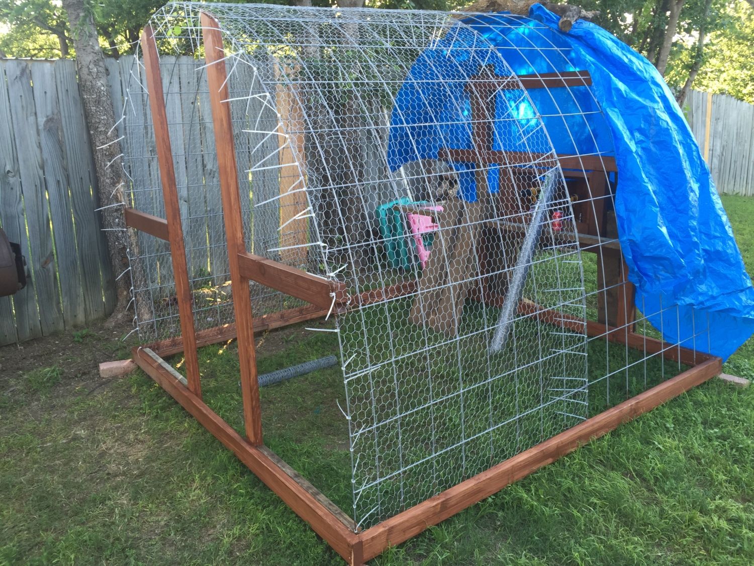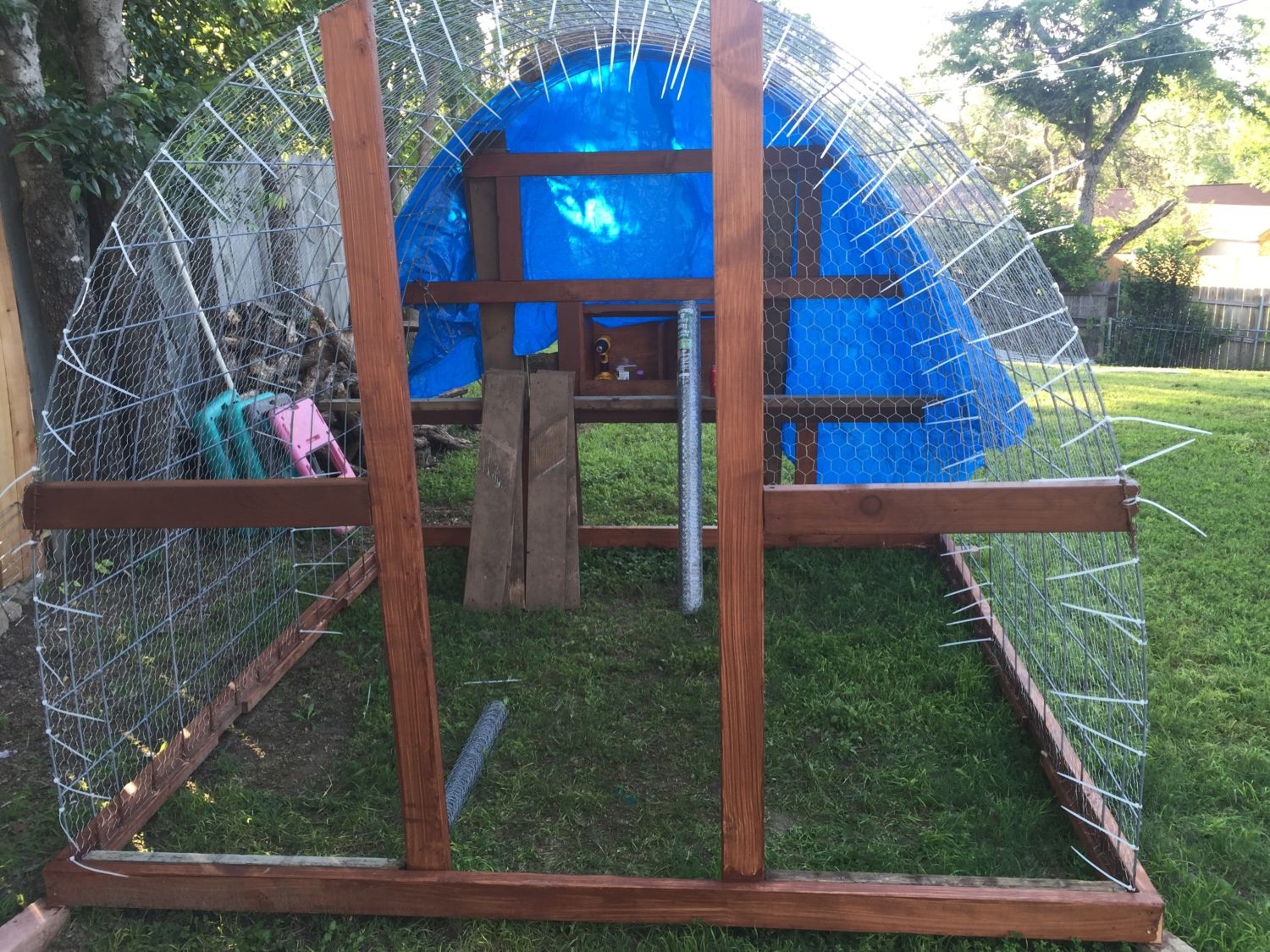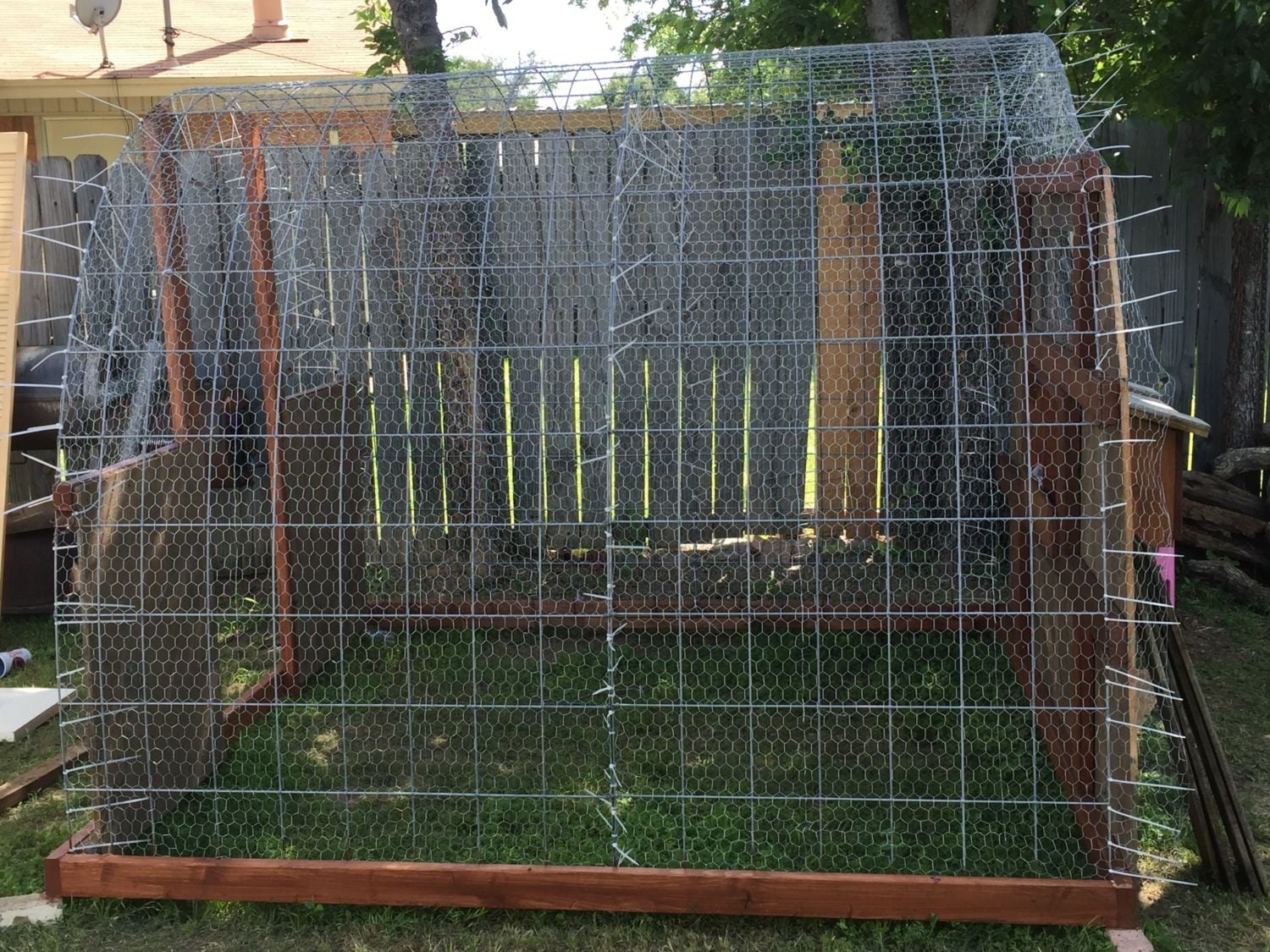 Looks like a job well thought out and executed. Sturdy hoop coop and run. You likely need to run some 2x4 welded wire or 1/2" hardware cloth skirted out about 18" and buried or covered with something (some people use paver stones) to make sure nothing can dig under the wall. Also, chicken wire is something raccoons can reach through and they, plus other predators, can rip it pretty easily. Might want to consider 1/2" hardware cloth run up a couple of feet on the walls.