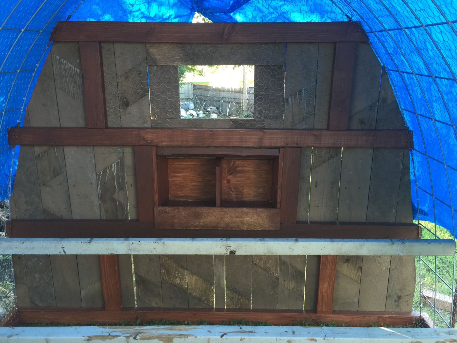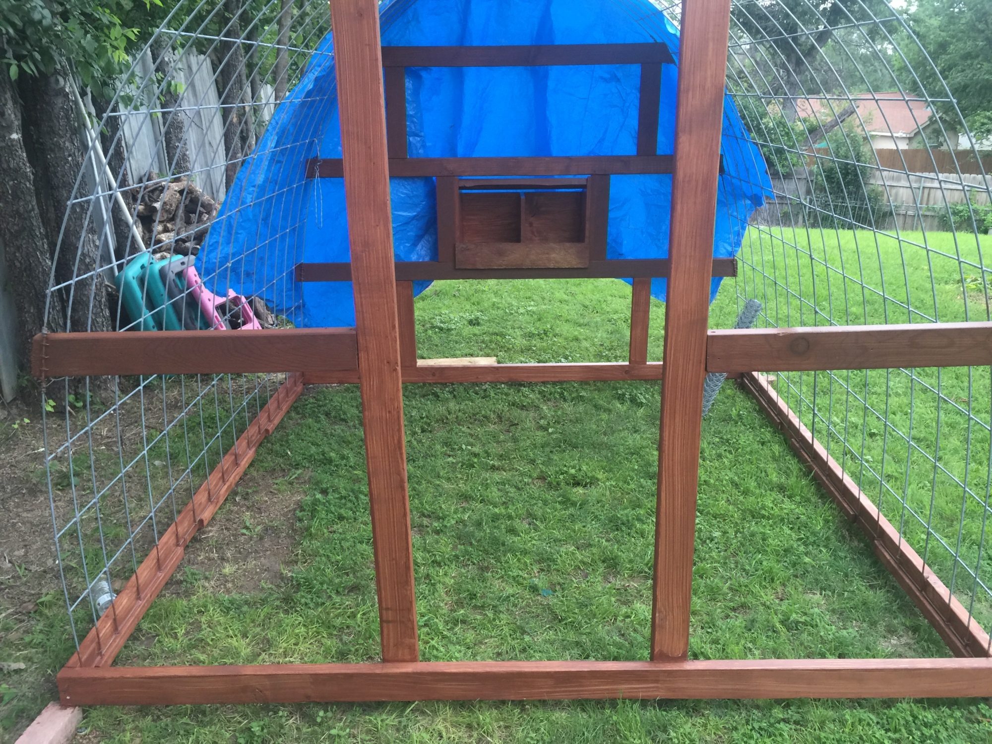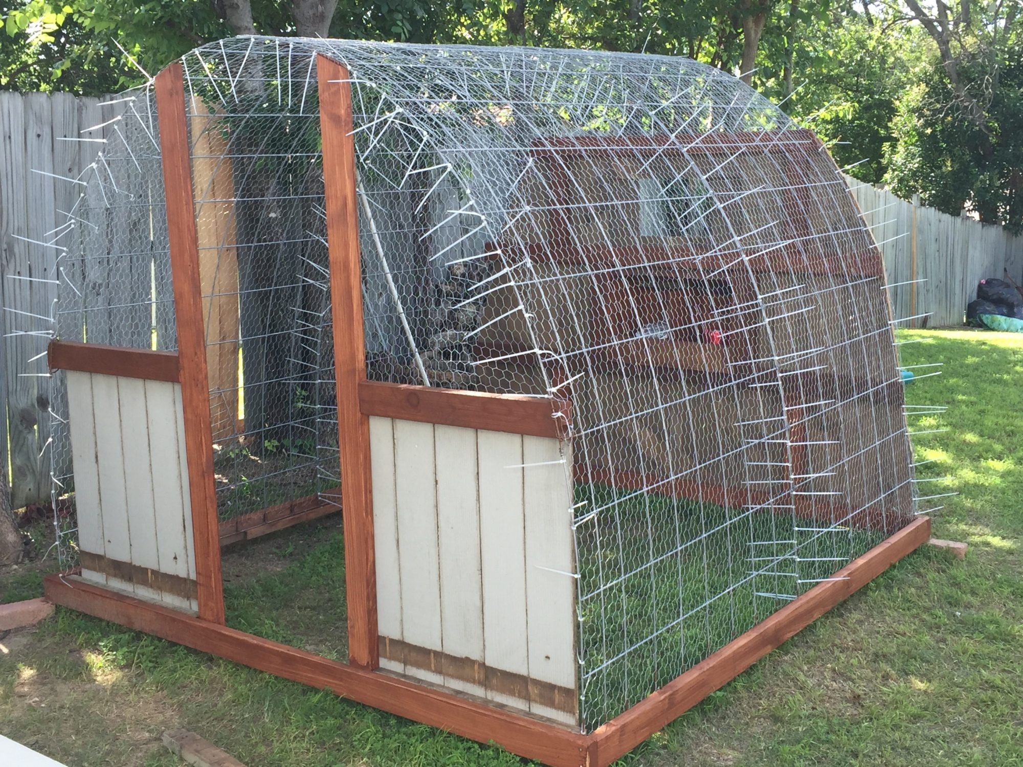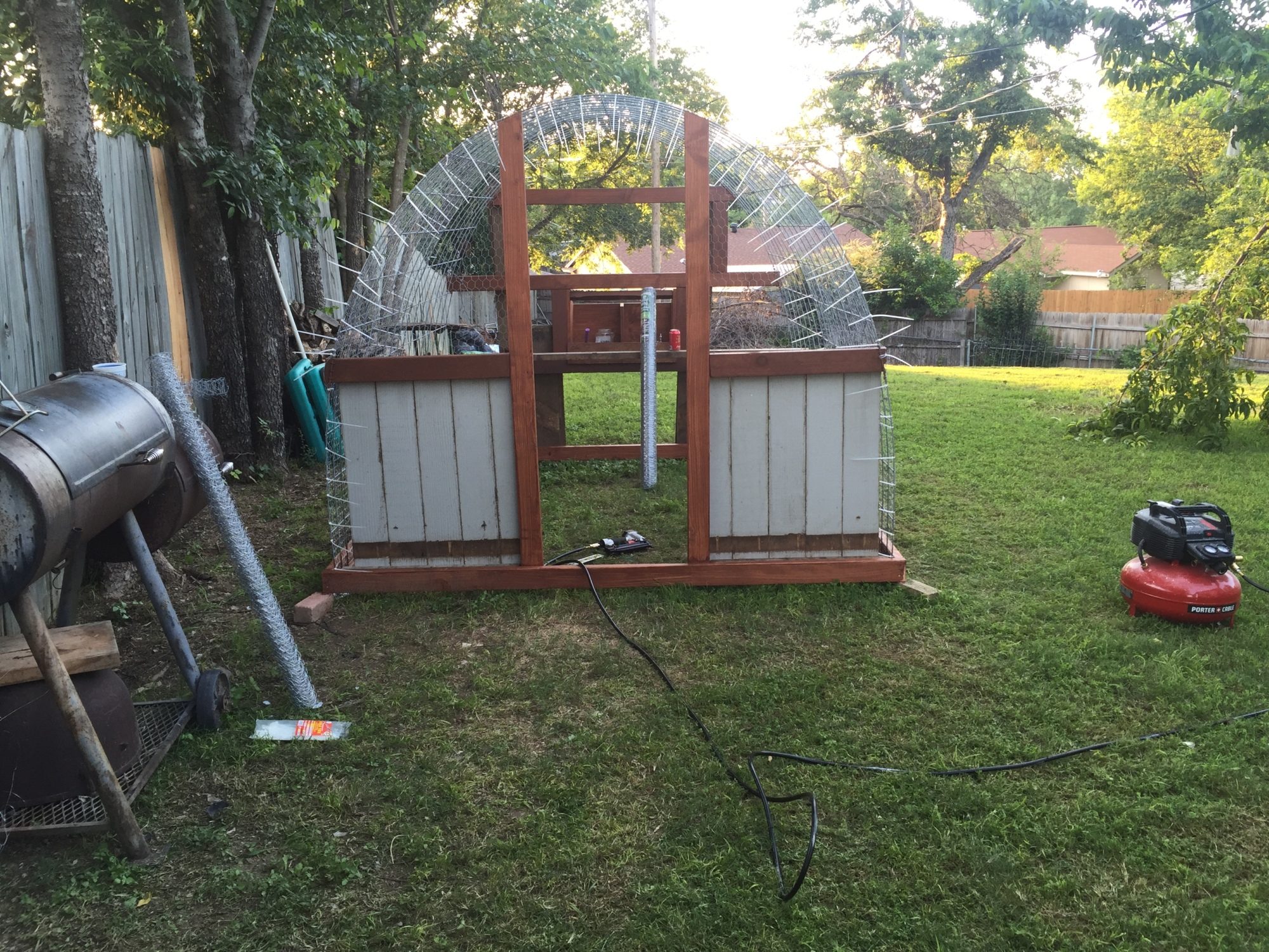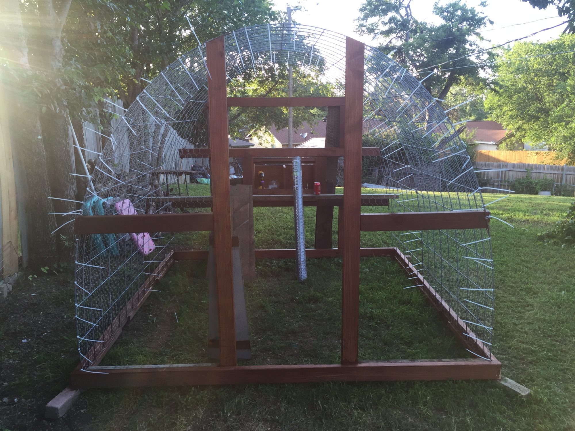 Looks like a job well thought out and executed. Sturdy hoop coop and run. You likely need to run some 2x4 welded wire or 1/2" hardware cloth skirted out about 18" and buried or covered with something (some people use paver stones) to make sure nothing can dig under the wall. Also, chicken wire is something raccoons can reach through and they, plus other predators, can rip it pretty easily. Might want to consider 1/2" hardware cloth run up a couple of feet on the walls.