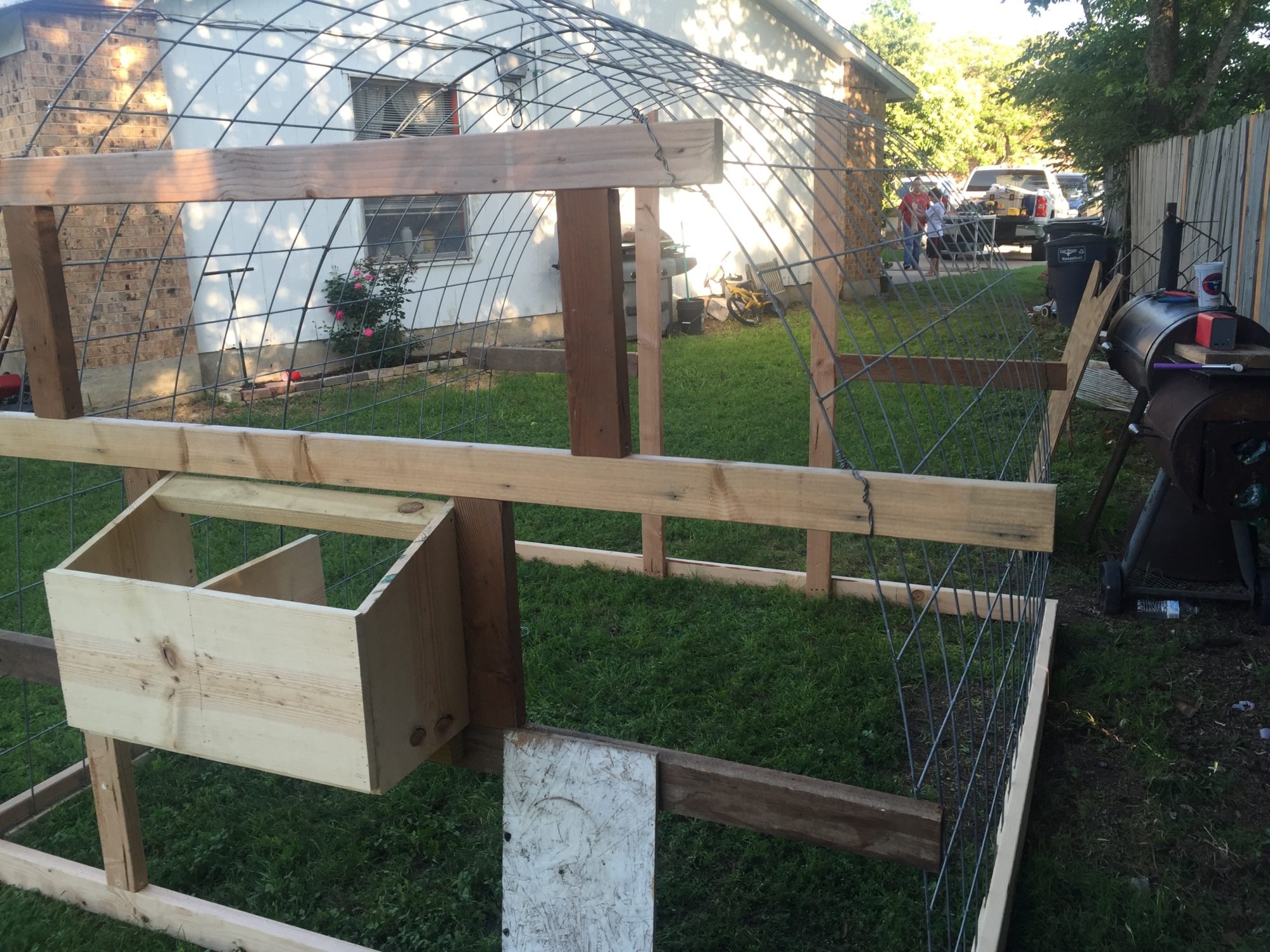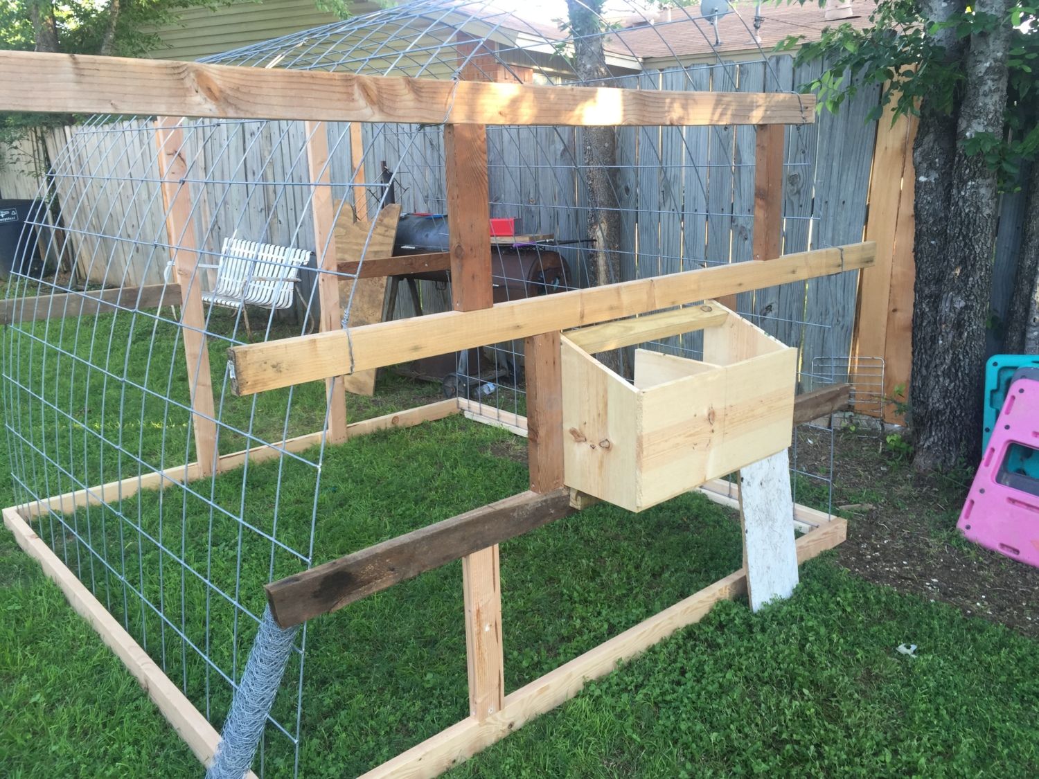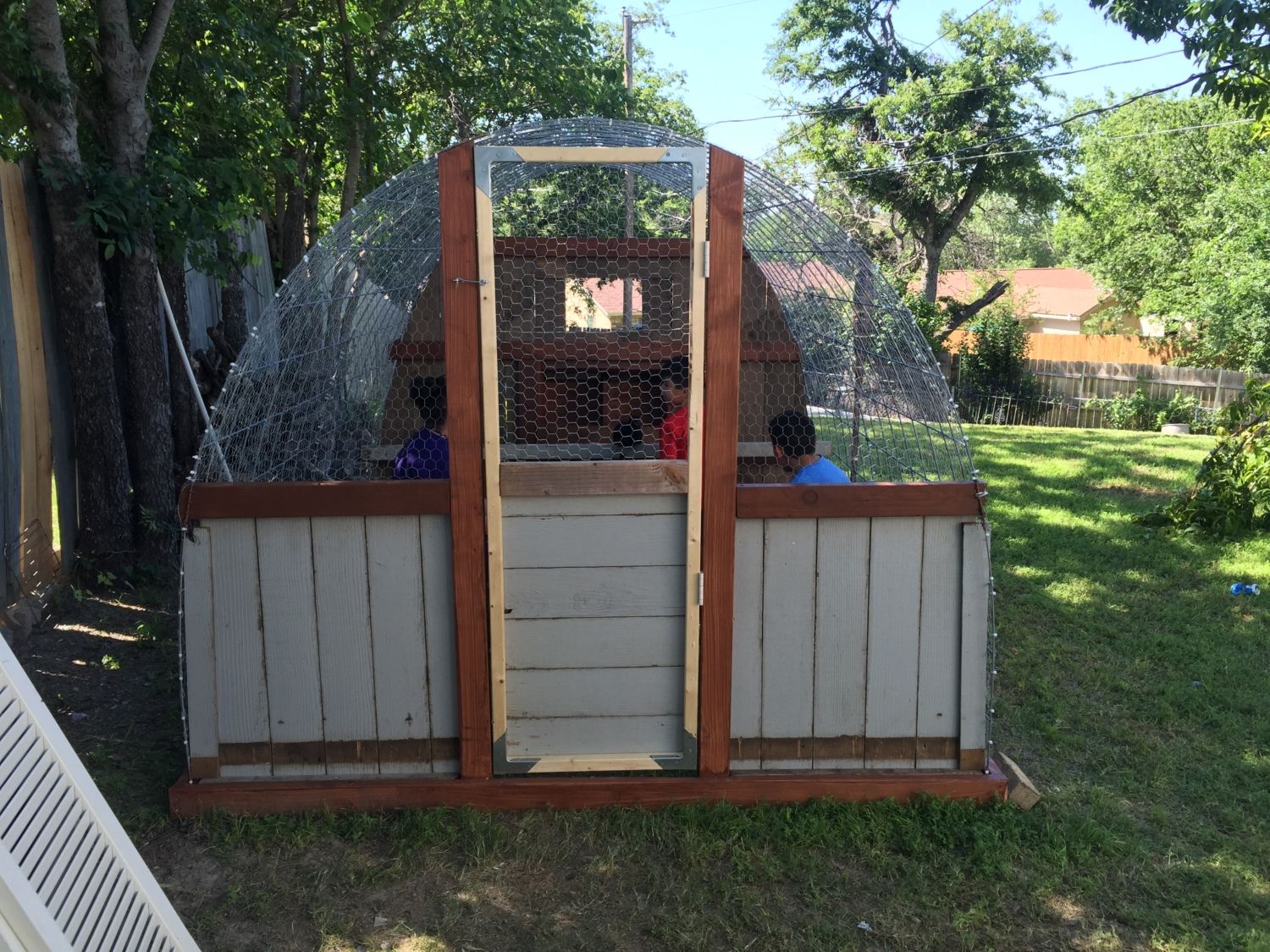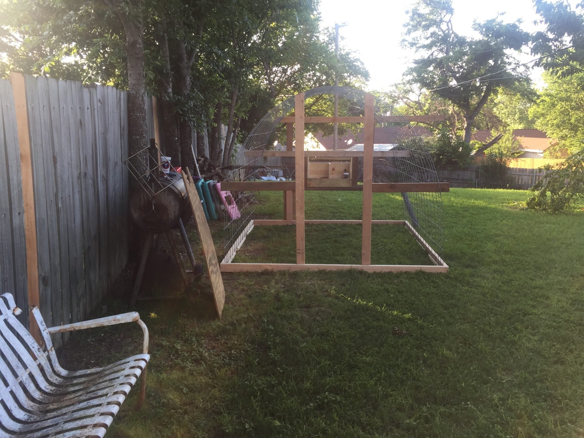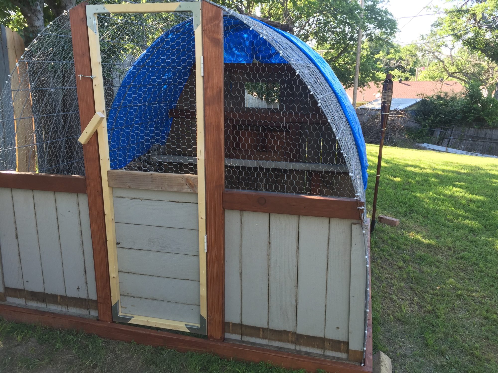 Looks like a job well thought out and executed. Sturdy hoop coop and run. You likely need to run some 2x4 welded wire or 1/2" hardware cloth skirted out about 18" and buried or covered with something (some people use paver stones) to make sure nothing can dig under the wall. Also, chicken wire is something raccoons can reach through and they, plus other predators, can rip it pretty easily. Might want to consider 1/2" hardware cloth run up a couple of feet on the walls.