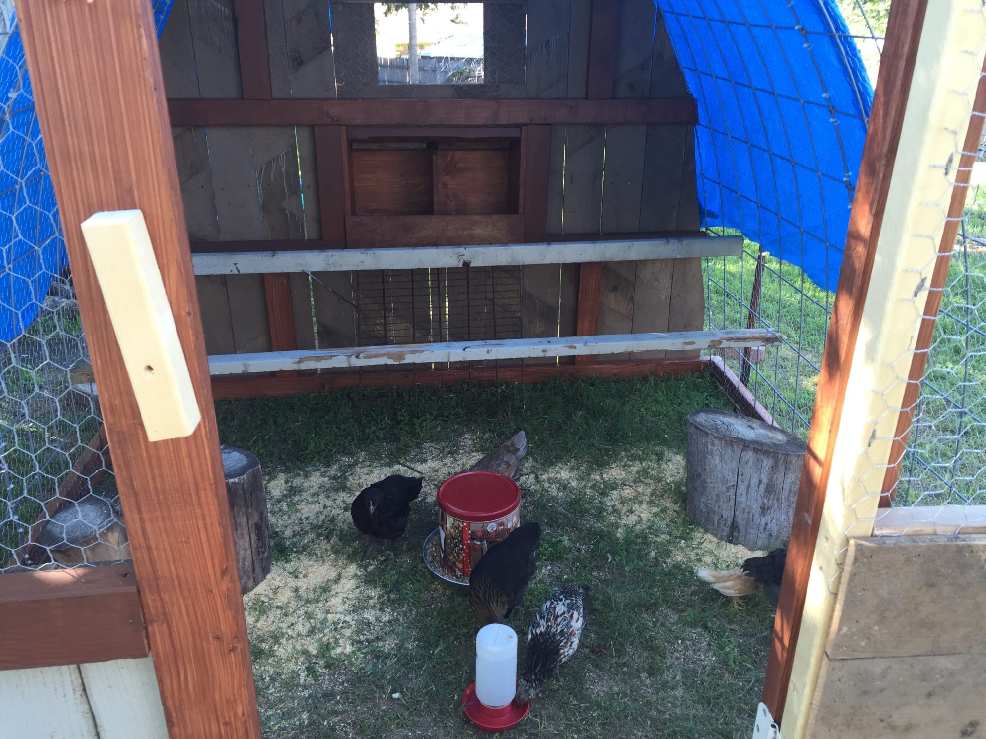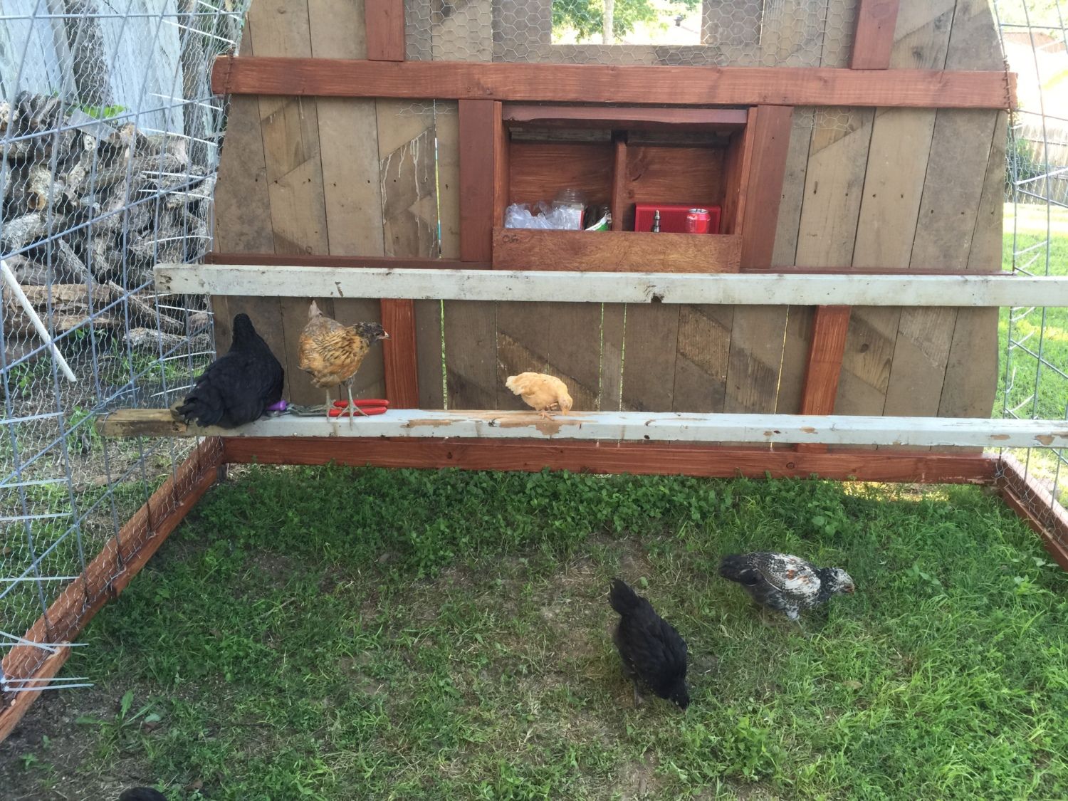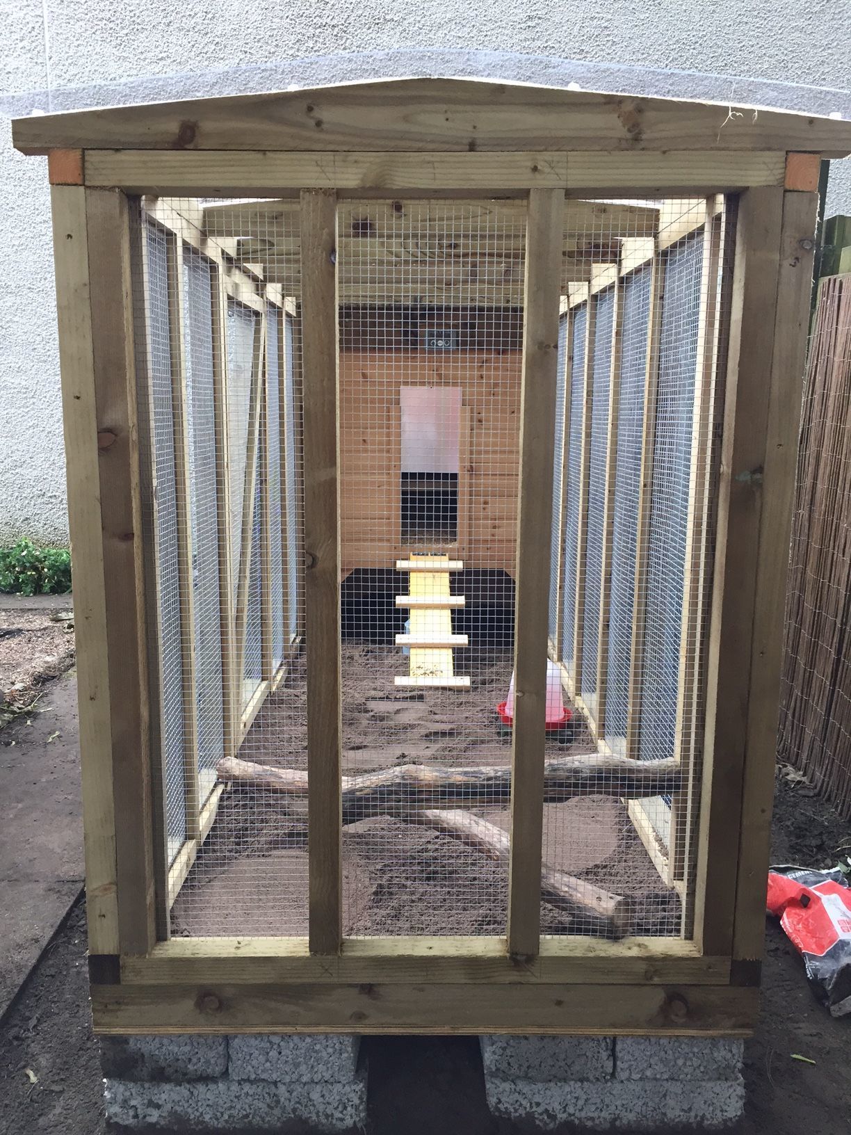 The run was built by a friend. It has a floor of treated marine ply which is a strong and water resistant wood. It is approx 8 foot long, 4 foot wide and 5 foot tall. I can get in to clean and fill water, feed, etc. I added two small tree branches as perches at one end. The roof is a strong plastic (it is used to protect stained glass windows in churches). I have sharp sand on the floor of the run which the girls seem to like and it is easy to skip out poo which I do every day.