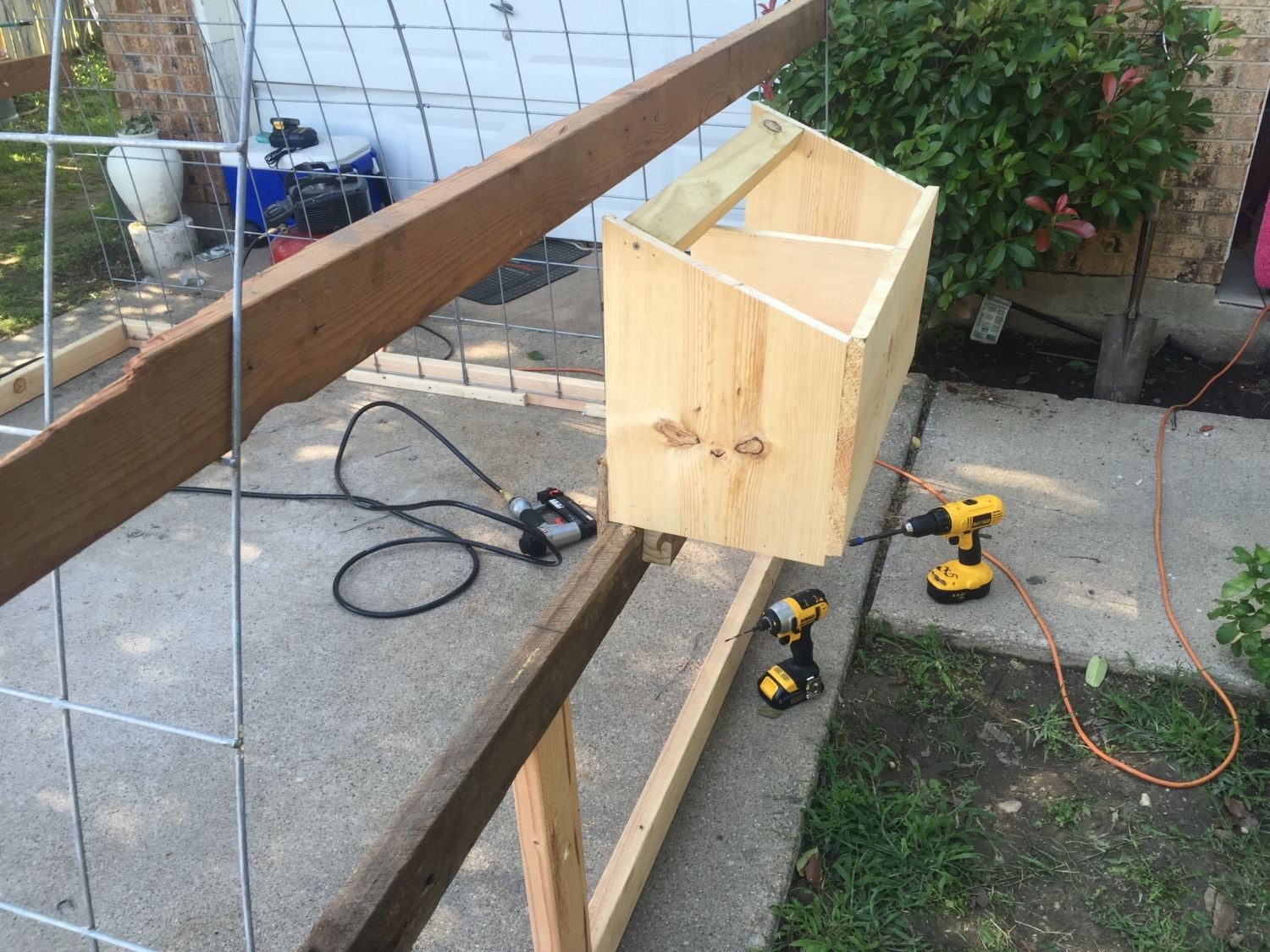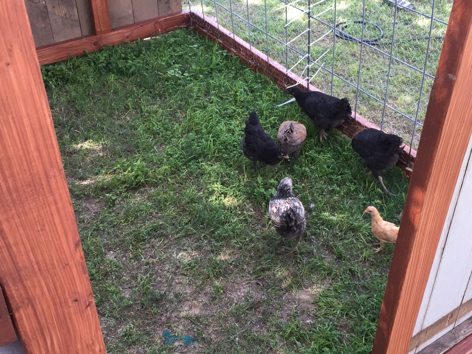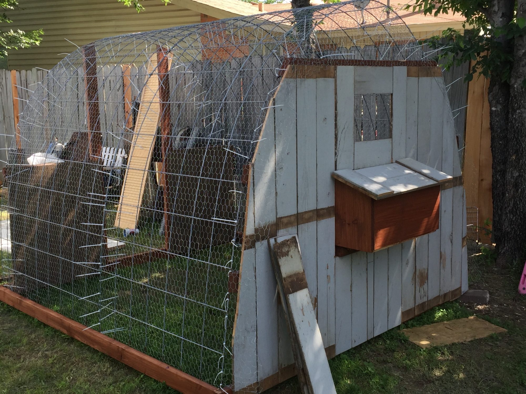 The run was built by a friend. It has a floor of treated marine ply which is a strong and water resistant wood. It is approx 8 foot long, 4 foot wide and 5 foot tall. I can get in to clean and fill water, feed, etc. I added two small tree branches as perches at one end. The roof is a strong plastic (it is used to protect stained glass windows in churches). I have sharp sand on the floor of the run which the girls seem to like and it is easy to skip out poo which I do every day.
