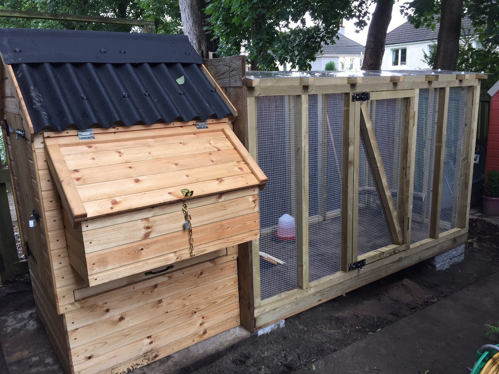 Looks very nice. I'm not sure how much ventilation is in the coop. A bit rainy in Scotland, no? you might want something to divert water coming off the roof and onto the nest box roof. However, it does look like the roof hangs past the hinged part of the lid so the issue would be more of how much water will be shooting off that nest box roof onto your slicker and Wellies (negating the problem if you are wearing them).