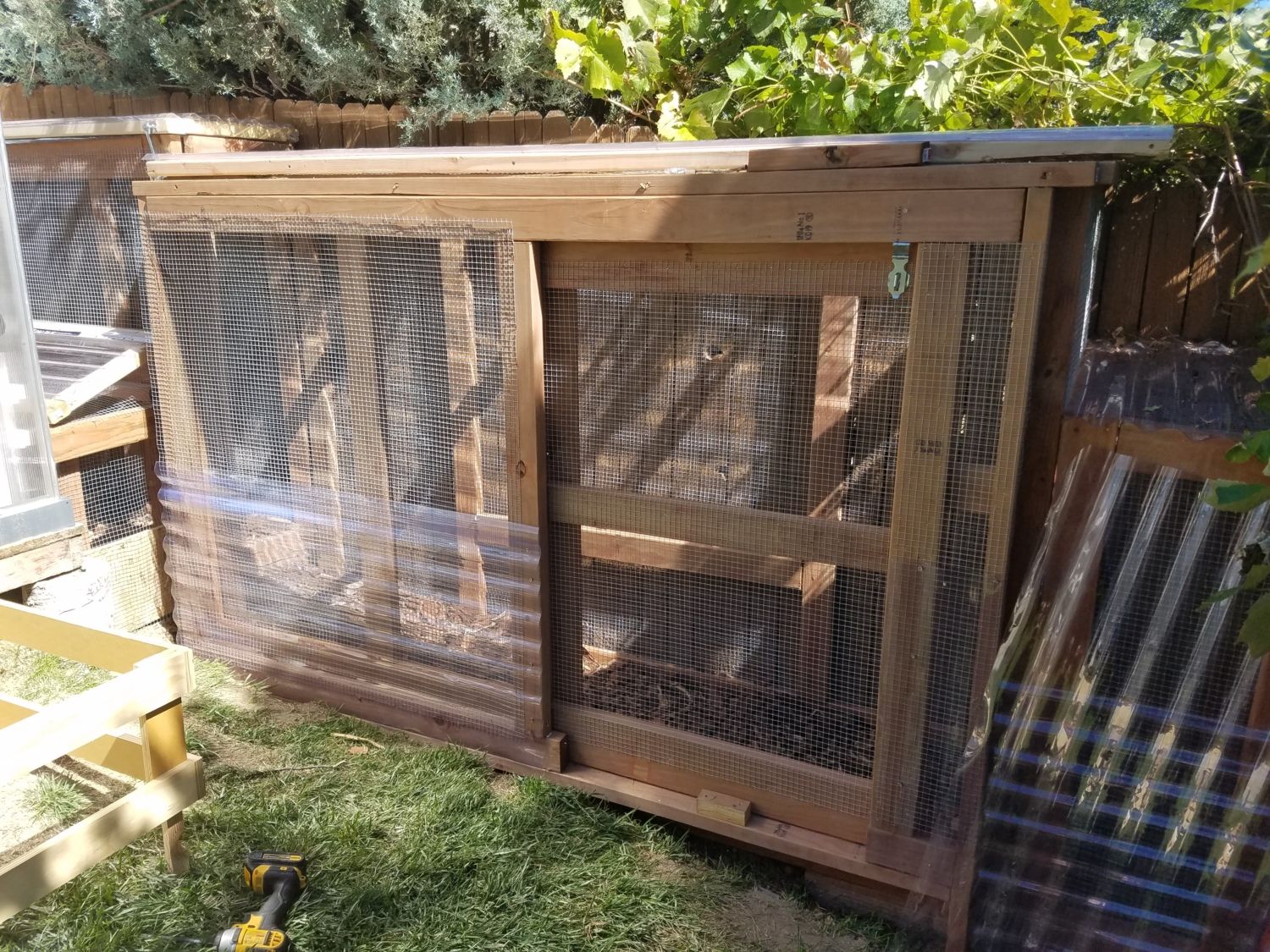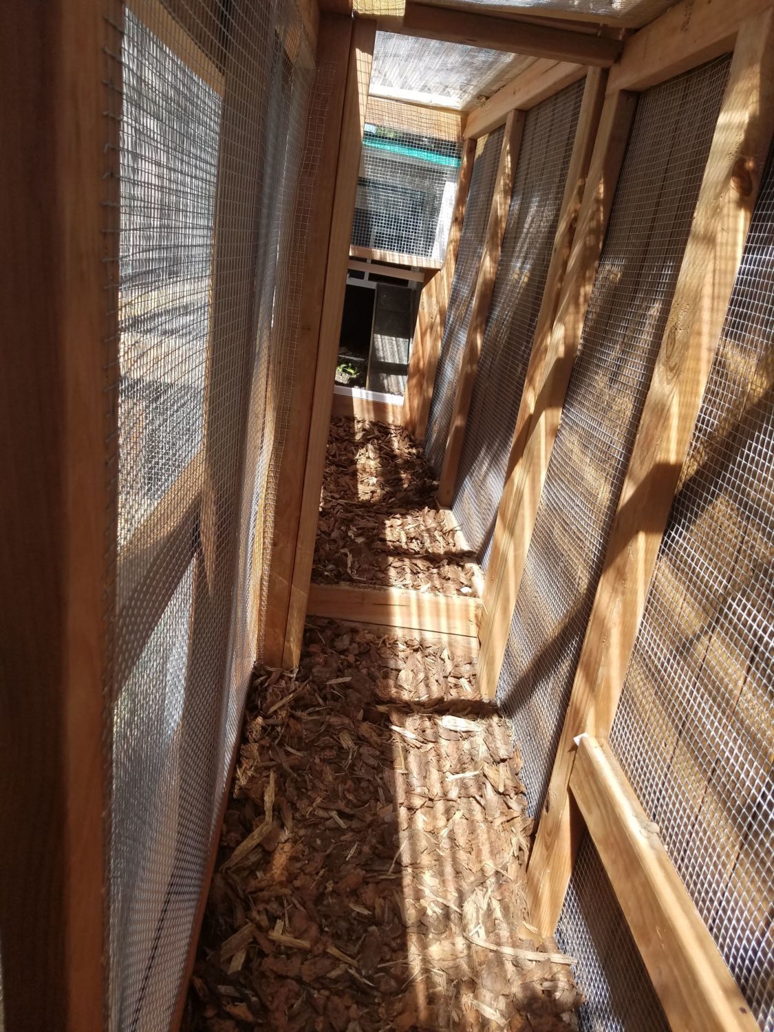 I finished the run today. Just need to add a couple of locks and something to hold the hinged lids up. I am so excited because I planned and built this myself! The skirting is to keep the dog from destroying her paws in her quest to get the chickens.
