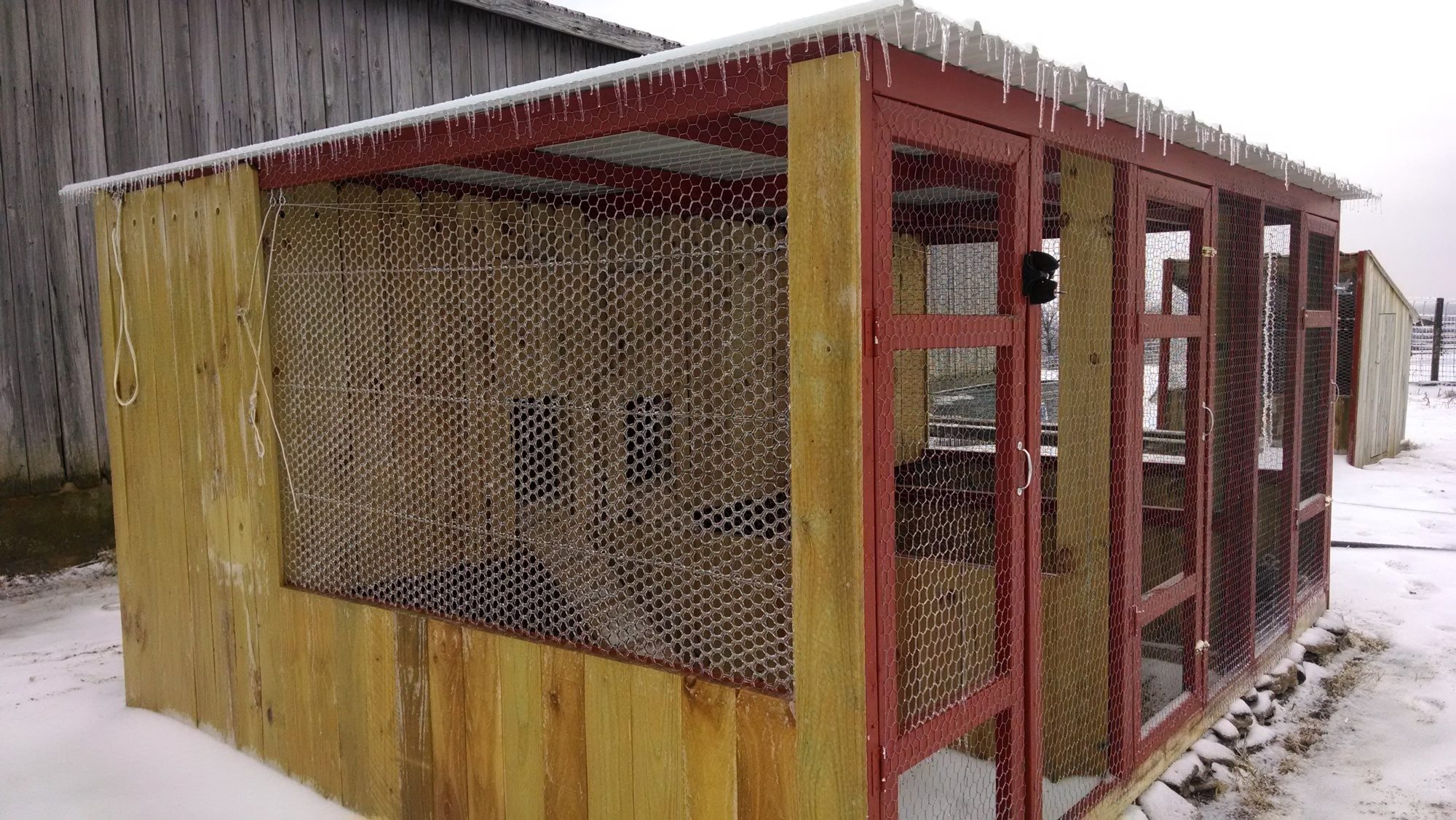 I Love your coop its beautiful! I saw it and thought wow that looks familiar! Then I saw your name LOL I'm your mail carrier! I hope the chick's that you got a week or two ago are doing well!Here are a few pics of the coop that we started in the spring. Size is 10'x24' We are hopeful that we will be able to complete it this spring, but for now it is a work in progress. Plans are to run underground power and water to it once the weather is nicer. It has two rooms. The entry room is a feed storage area and will eventually have a sink and will have our temporary brooder in it this spring. Walls and ceiling are insulated and the flooring is the plastic wood deck boards.You can barely see our automated chicken door on the left. This opens into a 25'x50' run. On hind sight, we should have used 5 foot instead of 4 foot fencing though.