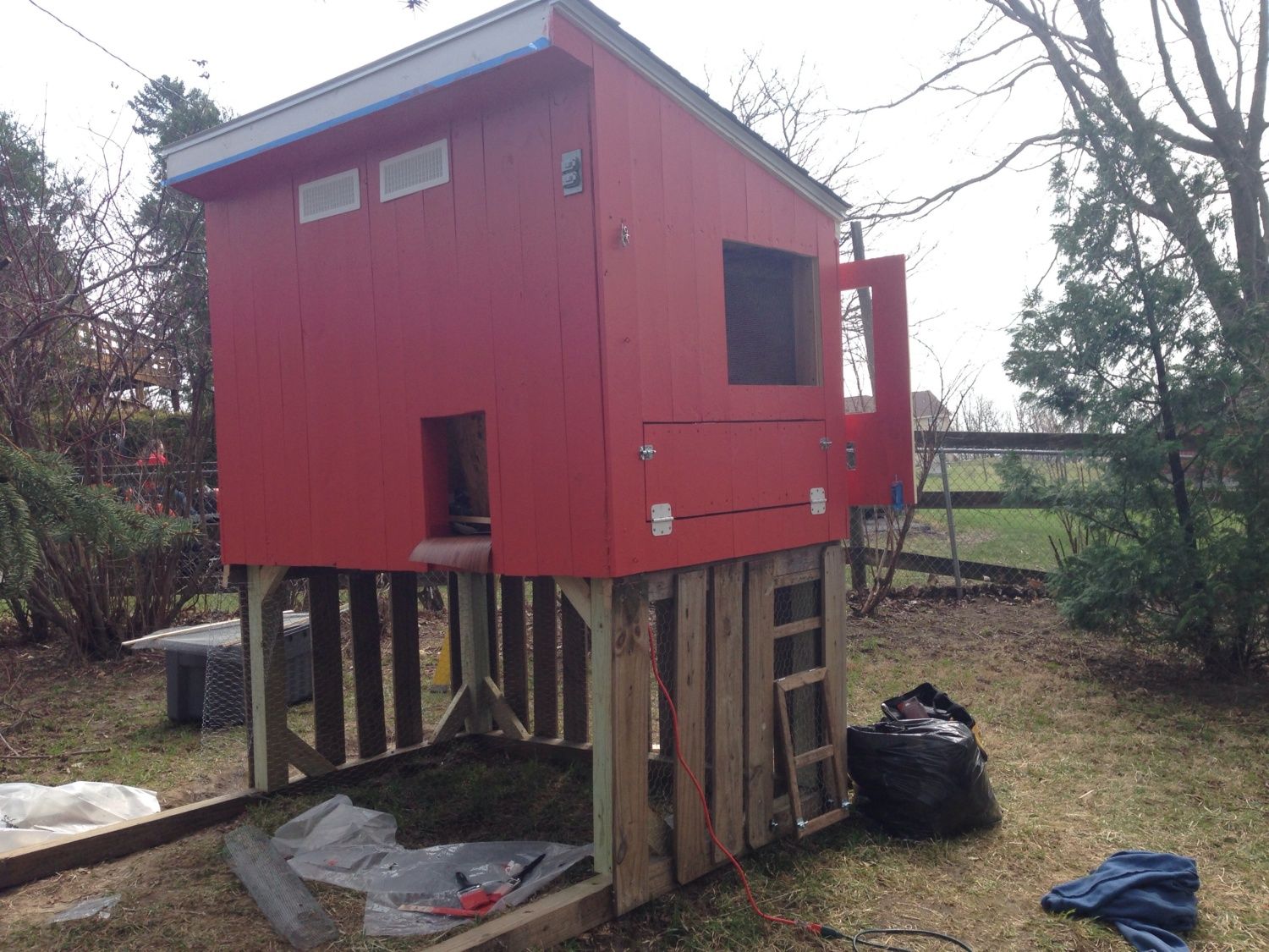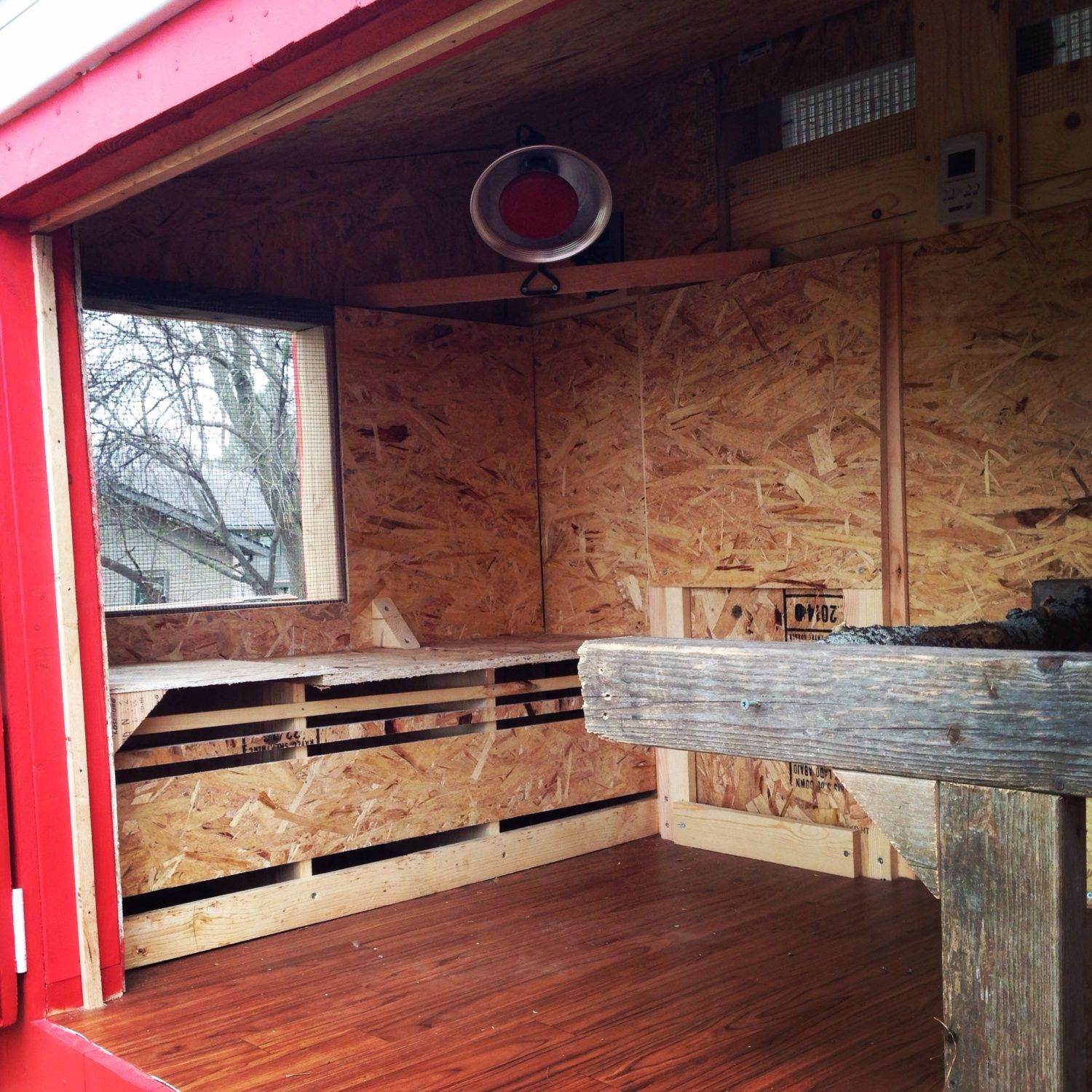 I know you're not done yet but as I put my 2 cents in like another post you'll probably want to line the roost/coop floor with some sort of easy-clean sheeting or smooth linoleum. Wood retains stains and uric acid odors - both unhealthy conditions for chickens that bedding alone won't solve. The place our 4 silly chickens like to sleep for the night is in the 3 nestboxes so a couple hens have to double up in a box. They have a roosting pole but prefer the nestboxes. So what we did is line the wooden box bottoms with custom fit plexiglass to keep the OCD hens from scratching up splinters into their toes/bleeding toenails and to make easy clean up of uric poop straw beddimg.
