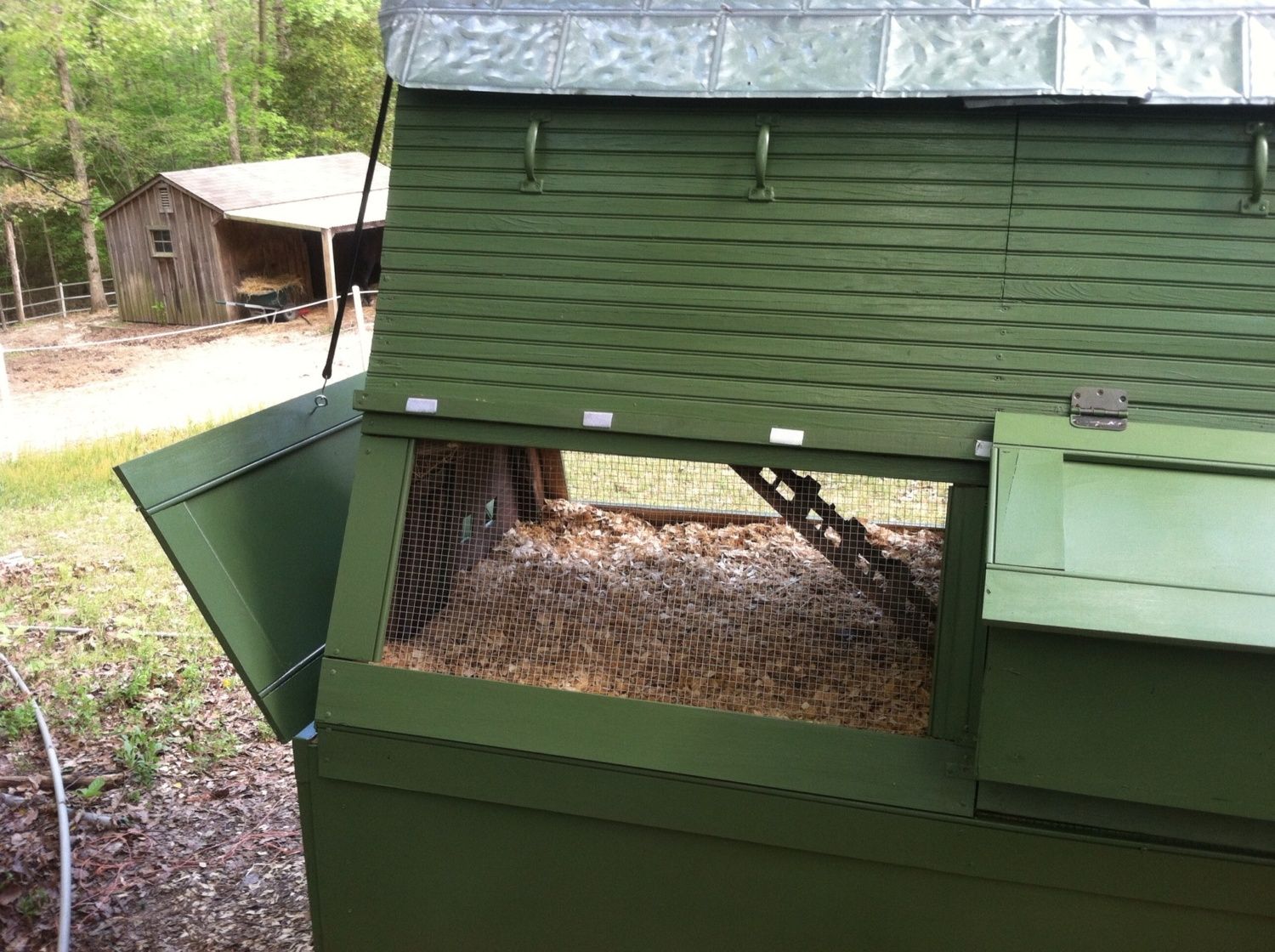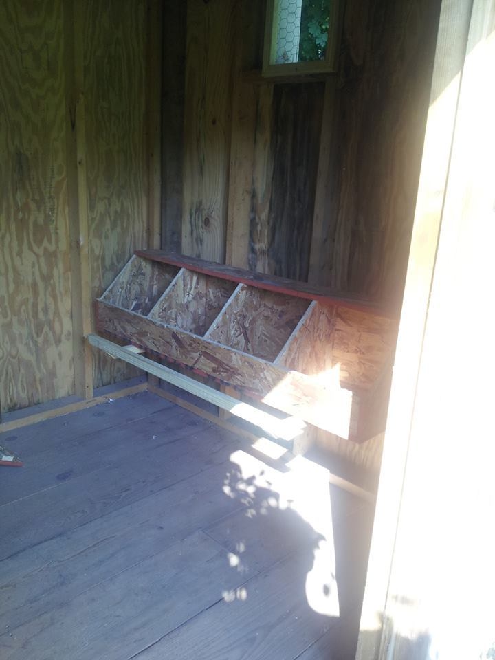 I also added a three cubby exterior nesting box to the back side and a floor with a hole to go down, by ladder, to the bottom level and exit. The top is shavings and the bottom is sand. There will be a 14X16 hoop run attached to the side you see propped open. I already have hardware cloth going down into the ground from the sides of the coop as it will in the hoop run so the nine hens will have full access to the run. I will still give them yard time when I am home. We love on 5 acres but their favorite thing is to go into the horse paddock and dig around in there.