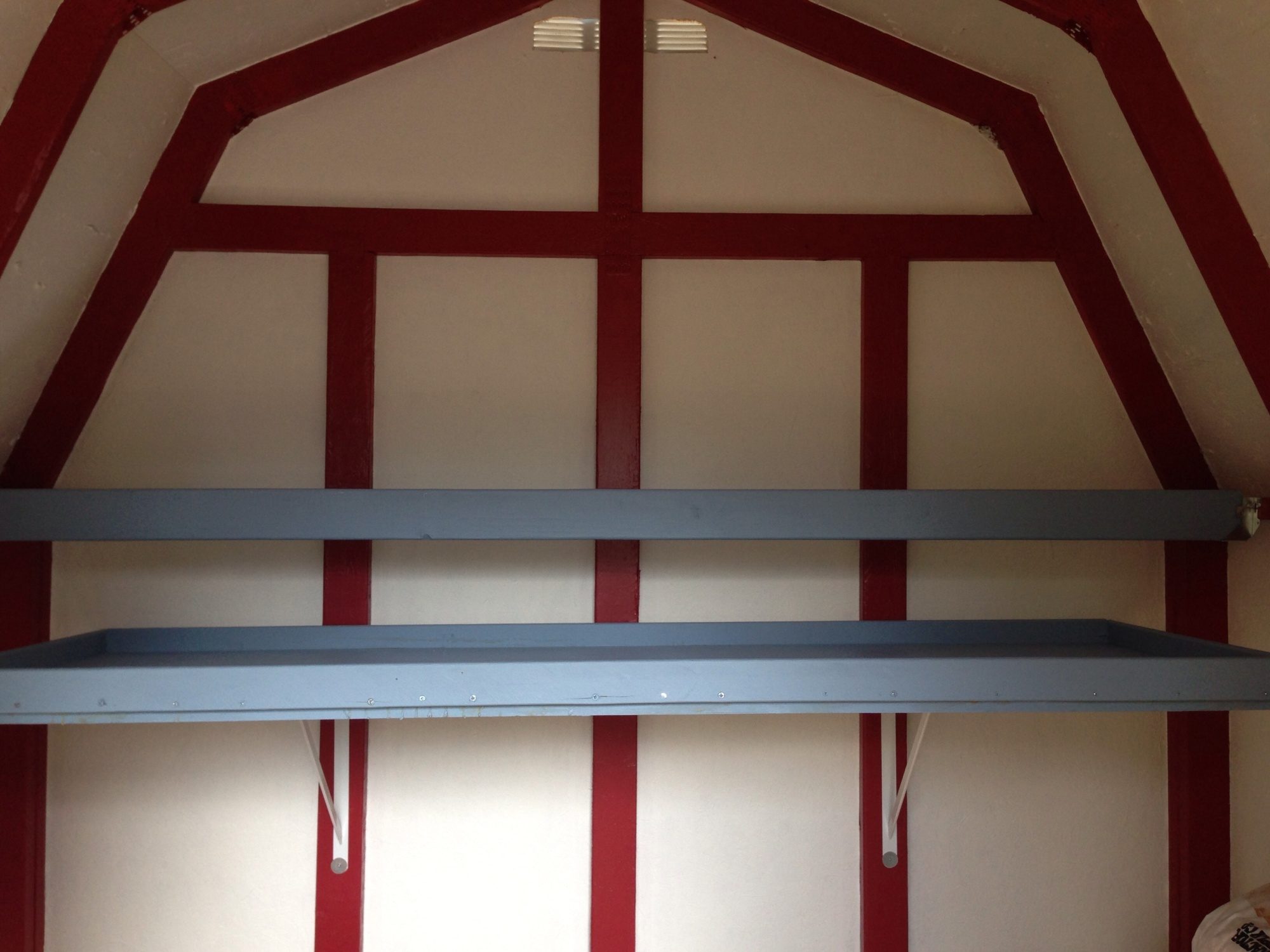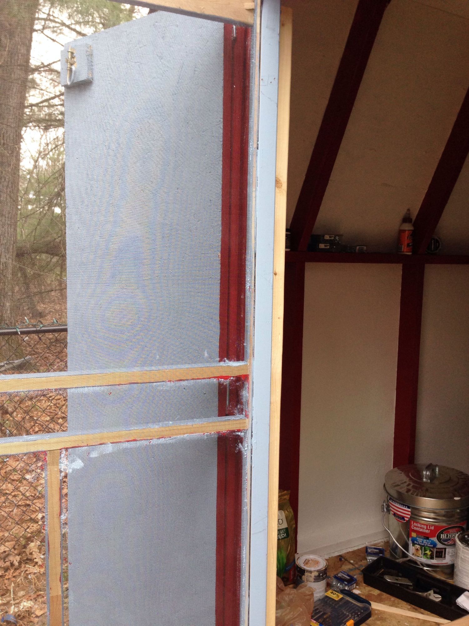 The door over the stairs can be accessed externally via a wire, and the screen mesh window is interchangeable with a solid glass window for the winter. On the back of the coop is a hinged door for easy egg collection, and below the coop is a hinged door (seen open in the picture) for easy access to below the coop where there will be water and food for during the day. On the front of the run is a full sized door, allowing us access into the coop!