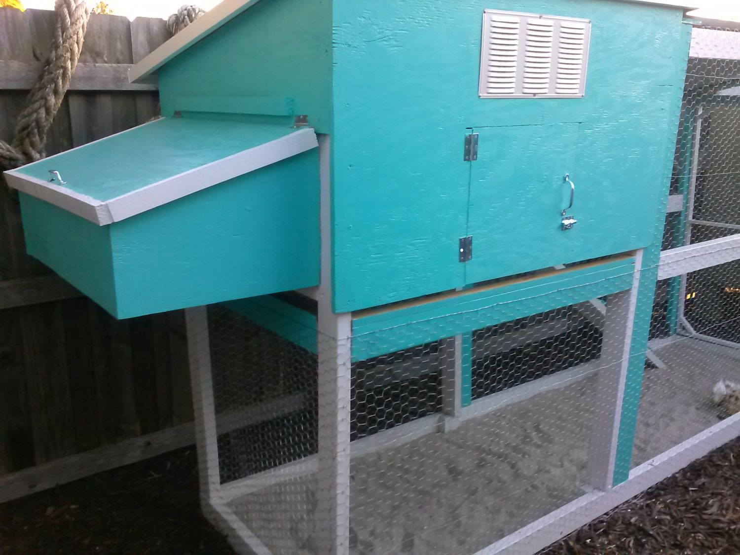 This is our coop. We are very new to this and bought this from a neighbor who builds them. He suggested no nesting boxes...that they will just lay on the floor. We did however buy a box from tractor supply. I'm already ready for a larger coop! Although we were told that there was room for approximate 6 I feel like its too small. I fact, we had 6 and 1 died a few days after getting them and I have decided not to replace it. Also I don't like how hard it is to get in and move around with the A-frame. It's very cute and build to last, but would suggest this for only 2-3 birds