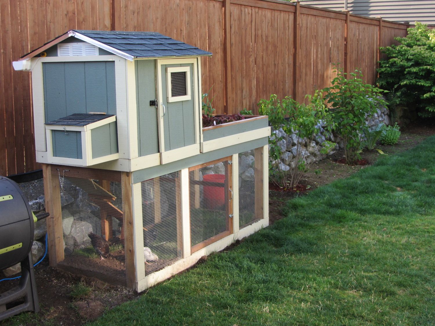 Here's my coop. I looked into buying one, but realized that I wanted a certain size and I didn't want it flimsy. So I went to home depot and bought all the supplies. It keeps evolving because I find things to change, but I love my coop. I designed it myself and did all the work myself. And I painted it to match our house!