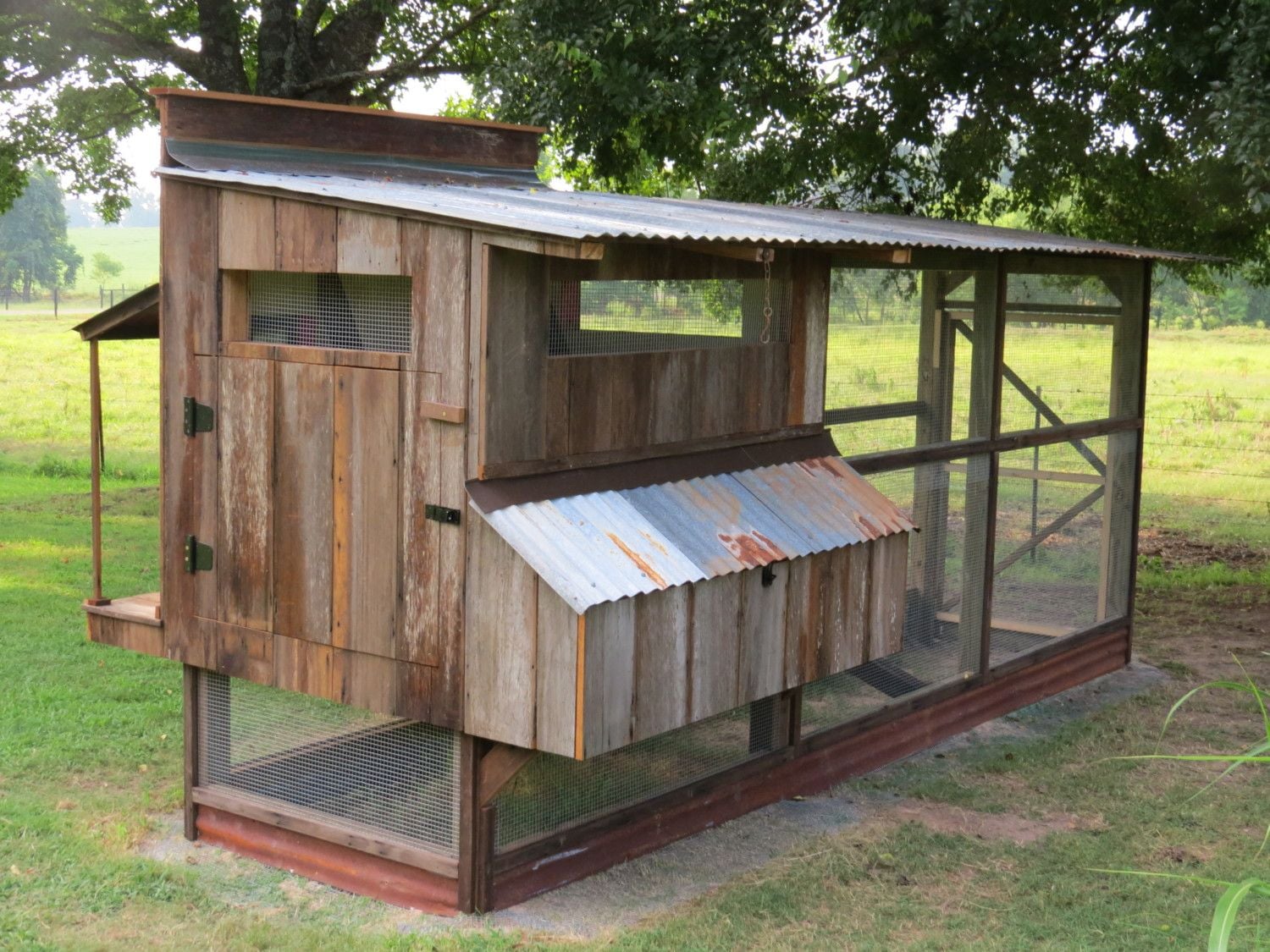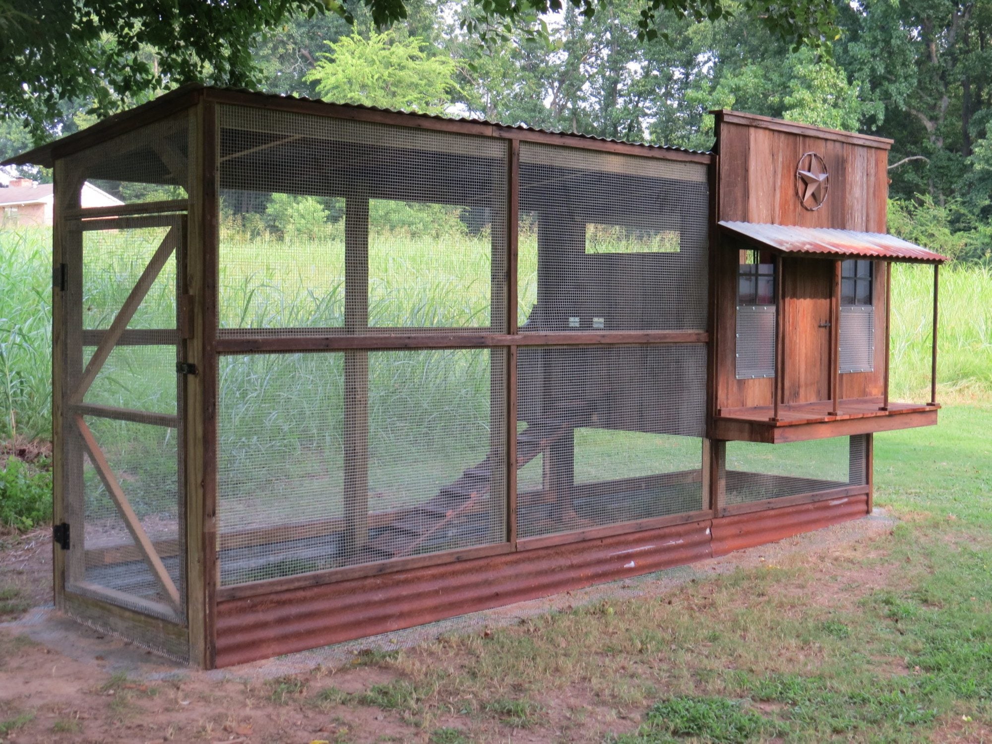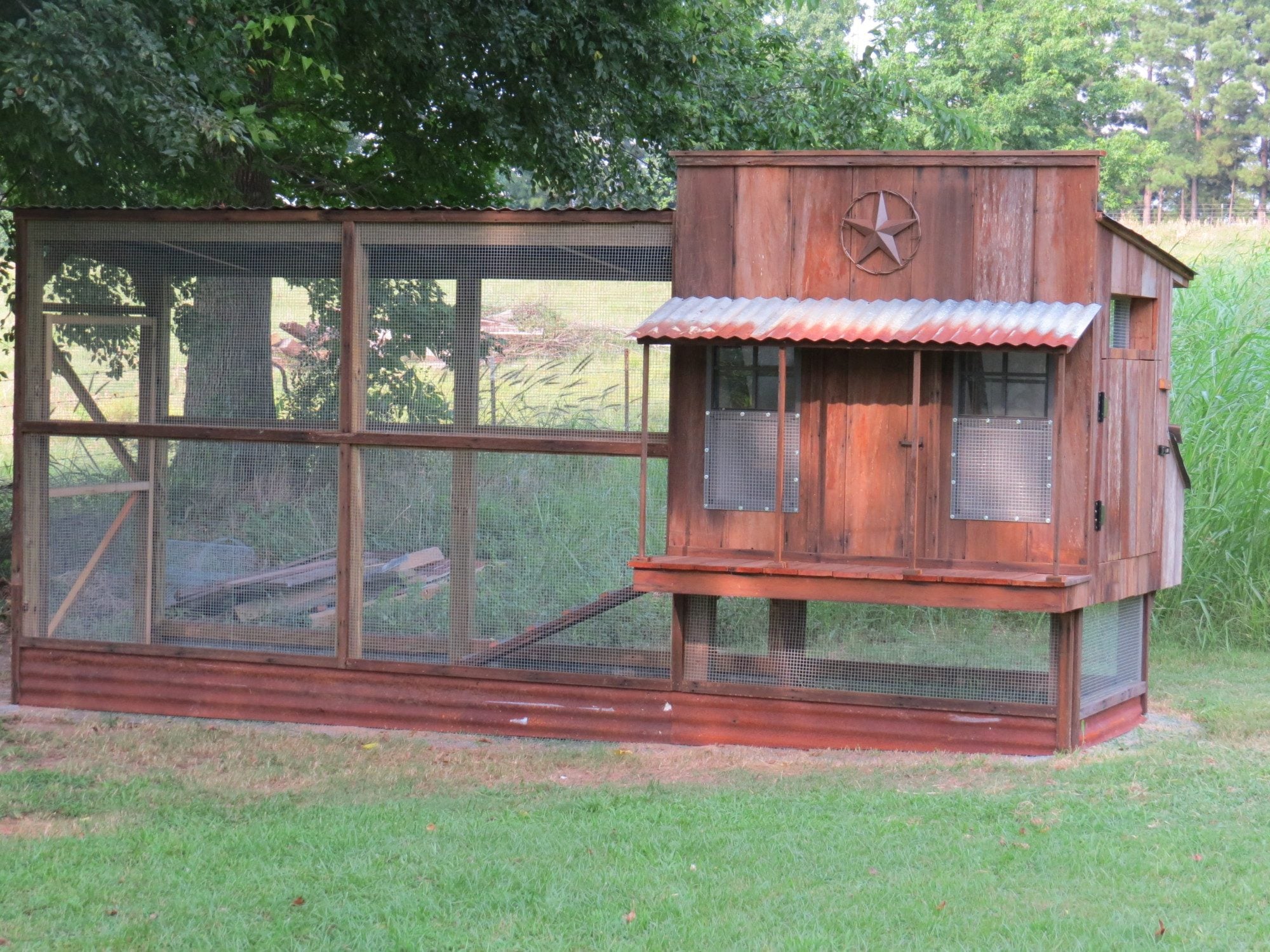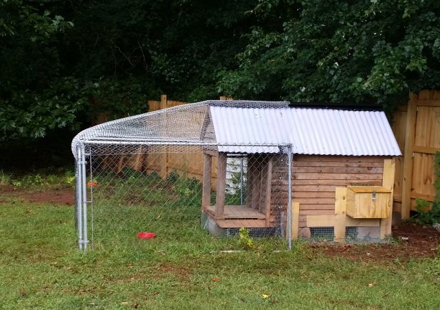 Here is our little coop. It was re-purposed from a dog house someone was getting rid of, and a dog run someone was selling for fifty bucks on craigslist. We added nesting boxes on the sides, a door that opens up for cleaning access on the back, and we re-did the roof because it was old warped plywood that was falling apart. It kind of looks like a tin roof in the photo, but it's actually the plastic stuff in light blue.