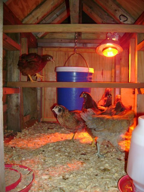 I'm surprised they even went in the coop with the heat lamp on. Cut some windows in the walls so they have light and it looks like it is seriously in need of ventilation.